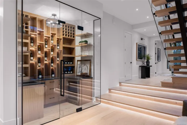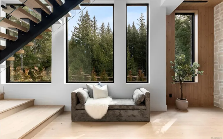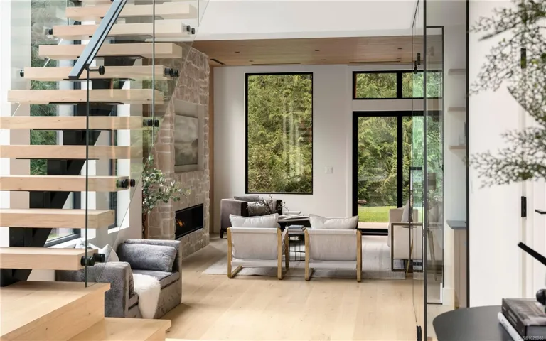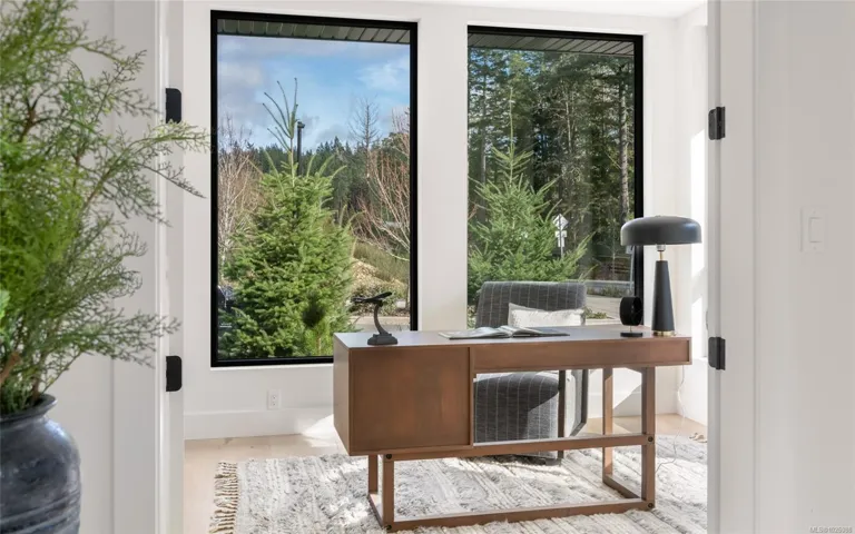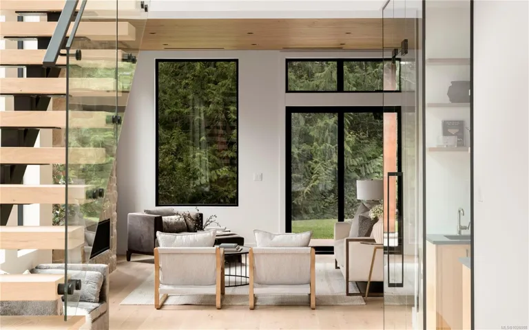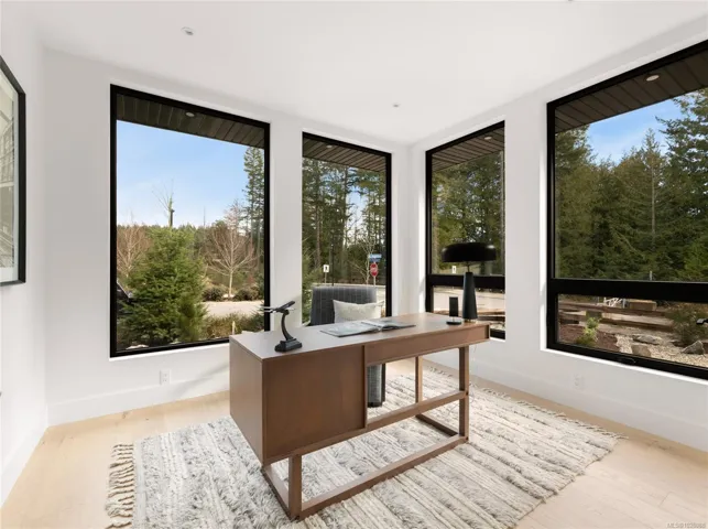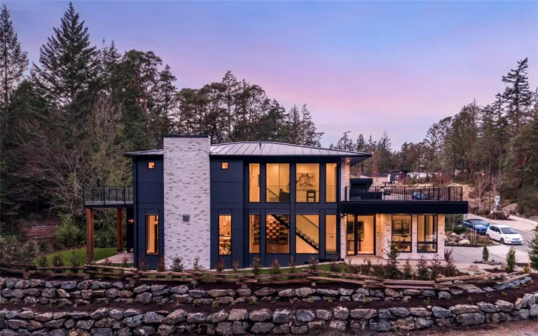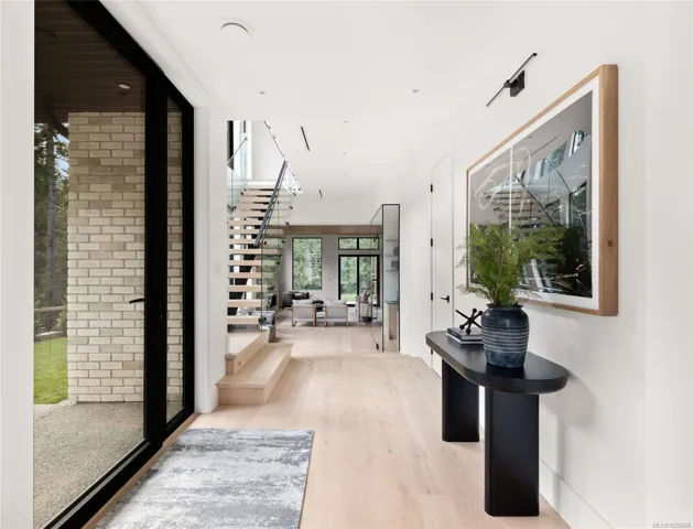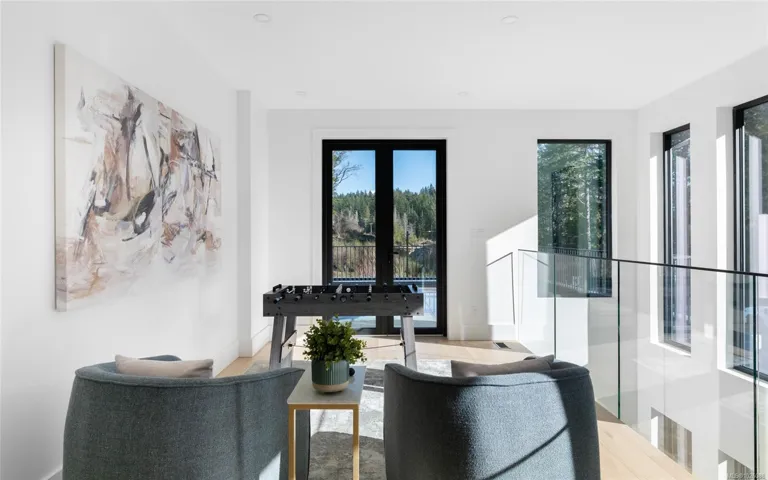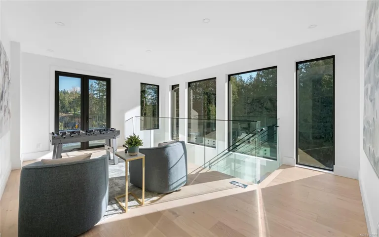 This exceptional West Coast Contemporary, Step Code 4–certified home blends performance with craftsmanship. Built by high-end boutique builder Qualis Builders, this home is situated on one of the most desirable lots in the Olympic View Golf Course, offering an abundance of natural light. Featuring premium windows with German hardware, an extensive brick exterior, & striking fir and wood ceiling details throughout. The interior showcases a dramatic floating staircase, rift white oak cabinetry, stone finishes, a dedicated office, & a thoughtfully designed layout with three spacious bedrooms, each with its own private ensuite. The gourmet kitchen is anchored by a 48” Fisher & Paykel range, ideal for entertaining. The spa-inspired primary ensuite features a his-and-her shower and custom wrapped cabinetry, while an incredible wine room and two gas fireplaces add a luxurious touch. Backing onto a serene greenbelt, this home delivers privacy, efficiency, & luxurious quality in every detail.