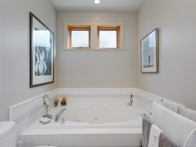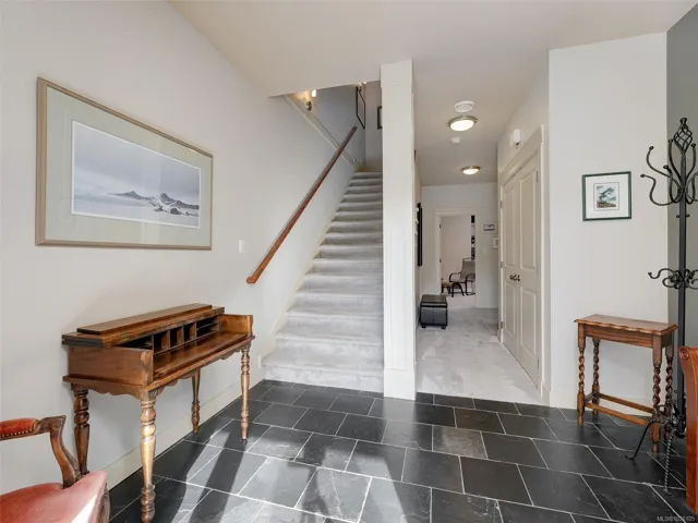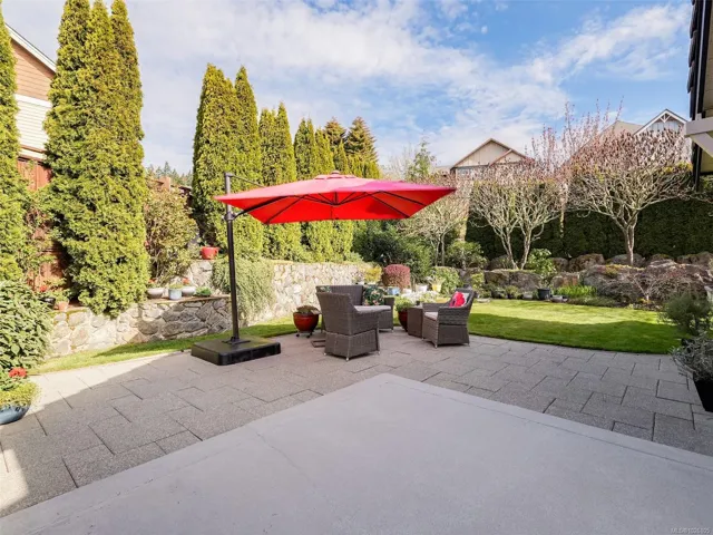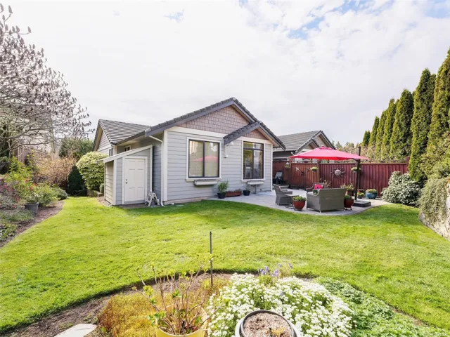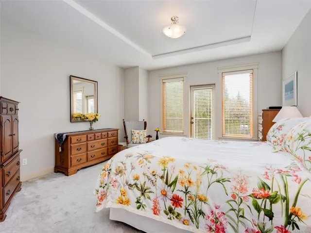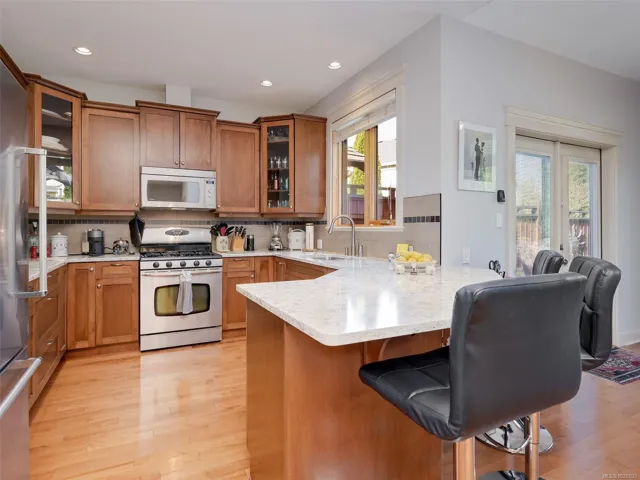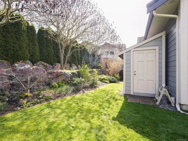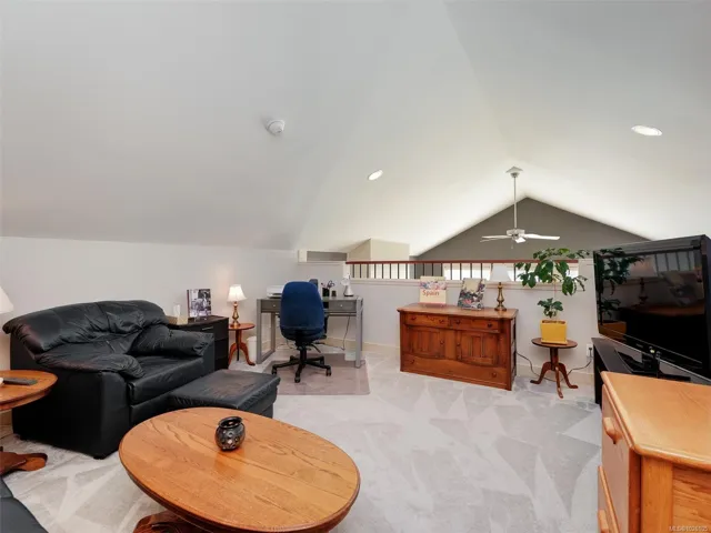 EXECUTIVE LATORIA WALK TOWNHOUSE. Featuring a spacious quality built 2 bed plus den, 3 bath home with vaulted 18’ ceilings and a loft area overlooking the living room with an abundance of windows to let the natural light in. The open floor plan features hardwood floors, custom built-ins, gas fireplace and a beautifully appointed kitchen with quartz counters, SS appliances, gas stove and eating nook. Main floor primary includes walk-in closet, 5-pce ensuite and a private balcony. Lower level offers large den/media/family room, plus ample storage. Private west-facing yard with patio & garden, front courtyard, full length driveway (rare in this complex), extra large double garage & new heat pump (2023), A/C. You will appreciate the private yard space with garden shed and BBQ gas hook up. A well run and pet friendly strata. Conveniently located steps to Red Barn Market, Pharmasave & walking distance to Olympic View Golf Club.