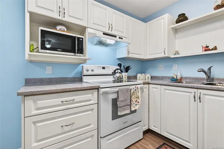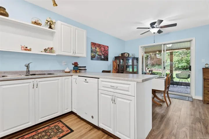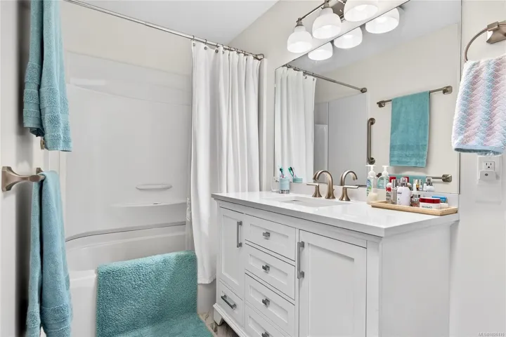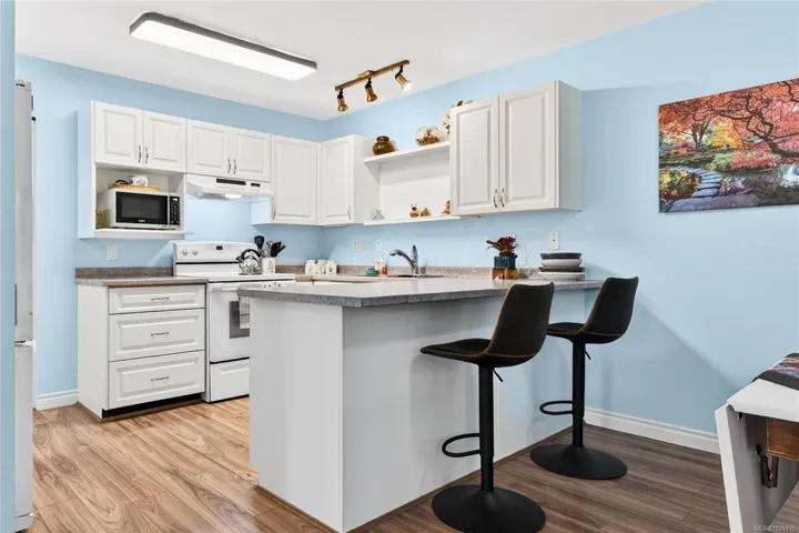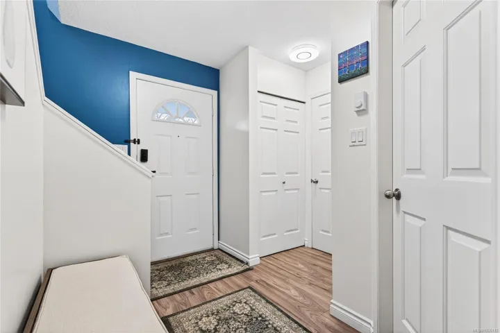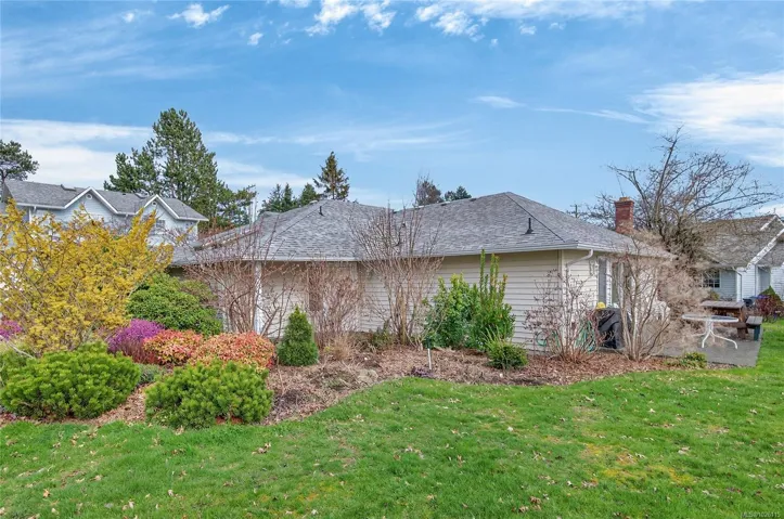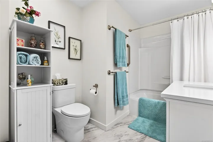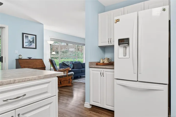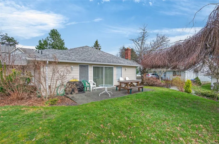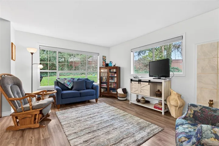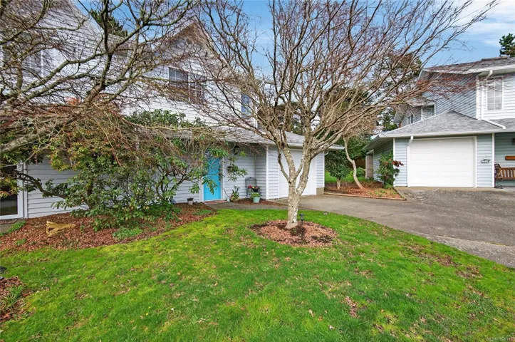 Welcome to Eagle Ridge Estates a beautiful 55 plus community in the town of Comox. This 1283 sqft two story townhouse style unit features a bright and spacious kitchen with plenty of cupboard and counter-space, the kitchen opens to a dining area and large living room complete with warm Gas Fireplace. Downstairs you will also find a updated powder room, laundry and garage access for your car, storage or recreation items. Upstairs is two bright bedrooms including a primary with walk-in closet, and a second bedroom that captures lovely ocean and mountain views and a fresh fully renovated main bathroom also there is a bonus storage room upstairs. This complex is in a great location within walk-able amenities and located in a great low maintenance strata community including access to a clubhouse and guest suite for overnight visitors. Lots of recent updates including easy care flooring, fresh paint, new window coverings, and a fully redesigned rear covered patio space.