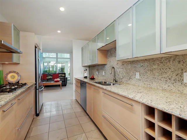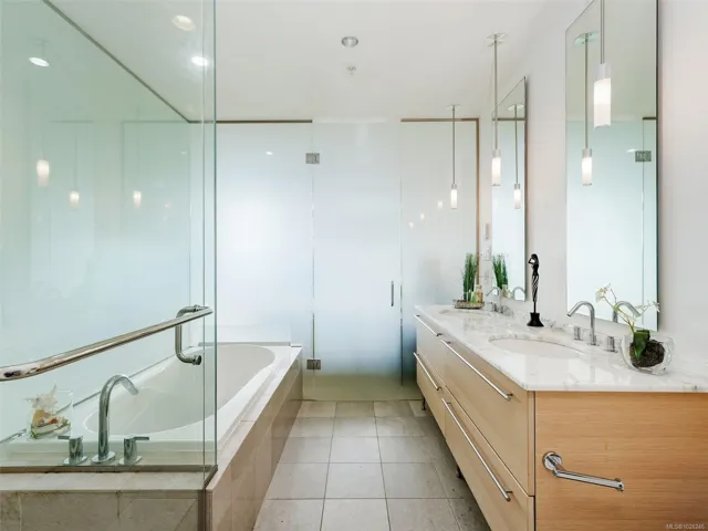 The Shutters, an exceptional lifestyle opportunity on the beautiful Songhees waterfront in Victoria. This elegant 2BD/3BA luxury home offers floor-to-ceiling windows showcasing views of the Inner Harbour. The spacious open-concept layout is designed for comfort and entertaining, highlighted by a stunning 34-ft balcony with BBQ hookup. The primary bedroom features direct water views, balcony access, and a spa-inspired ensuite with heated floors and a deep soaker tub. Includes a second bedroom with ensuite for guests and an additional powder room. Quality finishings throughout provide both functionality and sophistication. Resort-style amenities include an outdoor infinity pool,hot tub, sauna, and fully equipped fitness centre. Beautifully landscaped grounds with tranquil water features enhance the peaceful atmosphere. Just a short 10-min. walk to downtown Victoria for dining, shopping, and entertainment. An exceptional opportunity to enjoy luxury living at its finest.