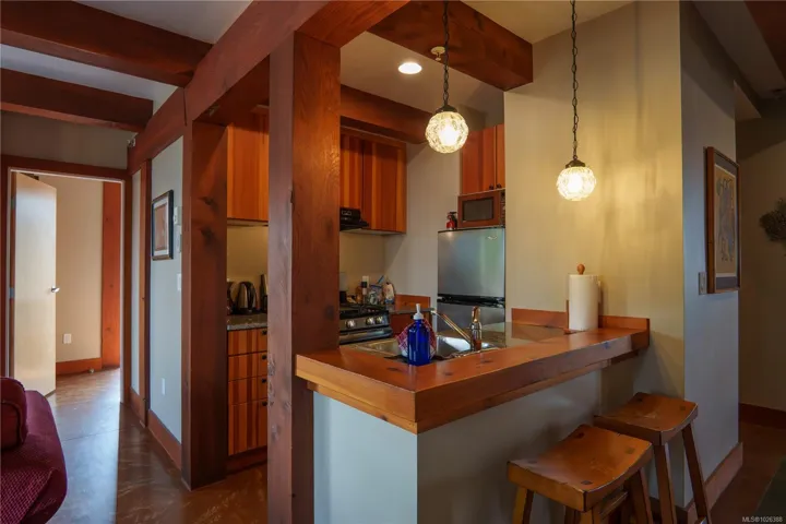 NIGHTLY RENTAL or LIVE-IN – Sunrise ocean view timber frame condo with locally sourced cedar and Douglas fir beams for sale at Whiskey Landing in the heart of Ucluelet. This beautifully appointed suite, right on Ucluelet Inlet, offers two bedrooms and two bathrooms, with an open living, dining, and kitchen area to create a bright and spacious atmosphere. The master bedroom has an ensuite bathroom with a soaker tub, making it a great space to relax. Indulge in views of Ucluelet Inlet and surrounding mountains from the comfort of your living area with a cozy fireplace. This property can be used as your permanent home, a personal vacation getaway, or a self-managed nightly rental, providing flexibility to meet your unique needs. Current use is a residential apartment and part-time nightly rental. Easy access to the Village Square, Whiskey Dock, Ucluelet Aquarium, and all of the town amenities. Owner enjoys generous revenue to off-set operating costs.