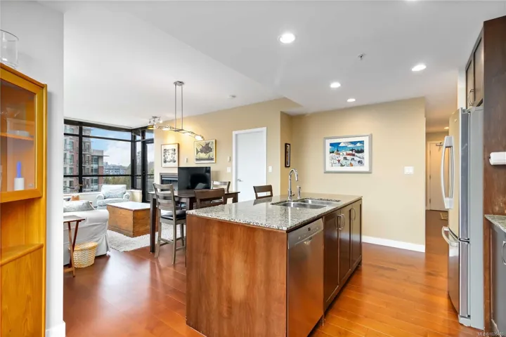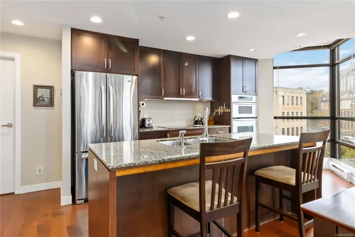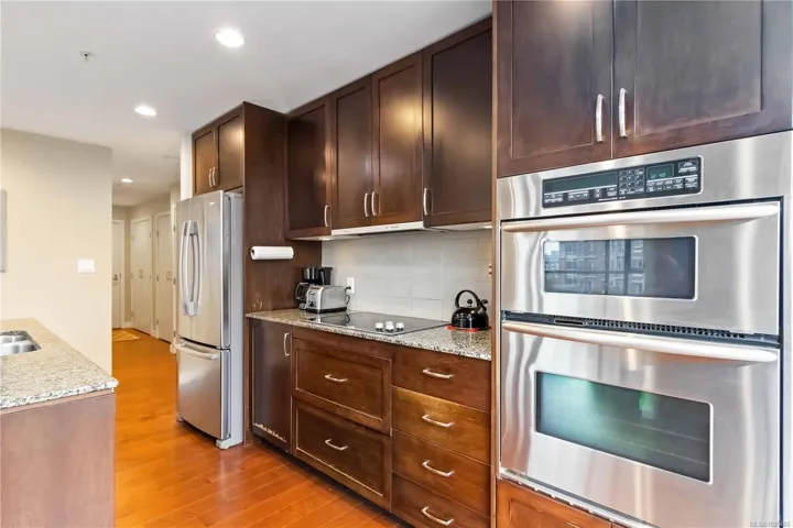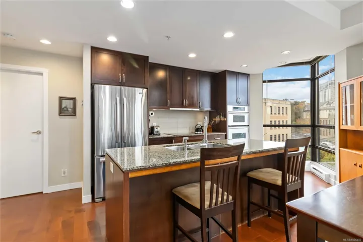 Welcome to Suite 603 at The Belvedere, a 2BR 2BA -1,050 SQFT corner unit in the sought-after steel & concrete building by Concert Properties in Victoria’s vibrant Humboldt Valley. This immaculate bright corner home offers walls of windows on three sides, flooding the space with natural light & showcasing treed city views. The open layout features a timeless kitchen with quartz counters, double oven, backsplash, & stainless appliances w/ hardwood floors throughout. The spacious primary suite includes double closets, full ensuite, & private balcony; the second bedroom is well separated with big windows. Private living room w/ Cozy fireplace & very functional floor plan with 2 balconies. Enjoy secure underground parking, storage, EV-ready options, fitness rooms, bike storage, & event space. Steps to the Inner Harbour, Empress Hotel, St Ann’s, Beacon Hill Park, & Downtown dining—pets & rentals welcome! Amazing walk score & lifestyle, tucked away from inner Downtown in the Humboldt valley!