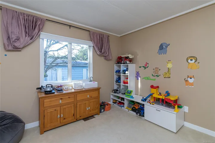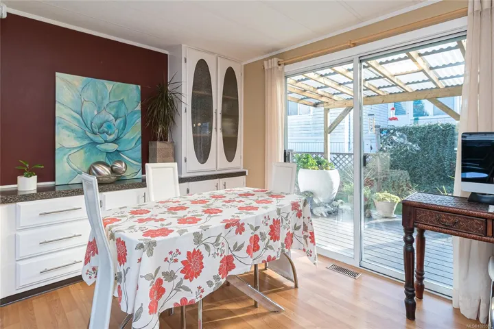 Welcome to this wonderfully maintained double-wide manufactured home w/ over 1,400 sq. ft. of bright, functional living space. The floor plan features a private master bed with a 4-piece ensuite, 2 additional beds & a 2nd 4-piece bath at the opposite end of the home. The heart of the home boasts a spacious living room, a dining area featuring a classic built-in hutch with deck access. A bright kitchen with abundant counter space & cabinetry, & bar seating. A separate family room offers the perfect flex space for a hobby room or office. Enjoy year-round comfort with a high-efficiency forced air heating system equipped with a heat pump, providing cozy winters & refreshing a/c all summer long. The fully fenced backyard has a large, covered vinyl deck that overlooks a sunny backyard primed for your gardening ideas. There is a covered carport with additional parking spots for guests, & a wired storage shed. Conveniently located just a short walk to groceries, pharmacy, & retail shops.