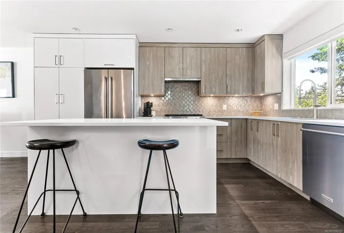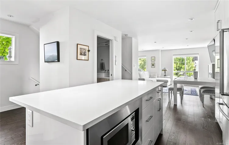 Welcome to 1032 Cloverdale Avenue – a stunning 3 bed, 4 bath end-unit townhome in award-winning Meridian Row by Seba Construction. Built in 2018, this contemporary 1,700+ sq. ft. home spans three levels, ideal for families or professionals. Enjoy designer finishes, wide-plank engineered hardwood, custom tilework, and a chef-inspired kitchen with quartz counters, large island, built-in pantry, and premium KitchenAid appliances with gas range. The main floor opens to a private balcony, perfect for outdoor dining. A flexible layout includes a lower-level bedroom with ensuite, spacious upper bedrooms, and 4 baths. Comfort features include a heat pump, on-demand hot water, central vacuum, and EV/solar-ready setup. Enjoy a private yard, added light, and privacy as an end unit. Located minutes from downtown Victoria, Uptown, Mayfair Mall, parks, schools, and transit—luxury, lifestyle, and location meet here.