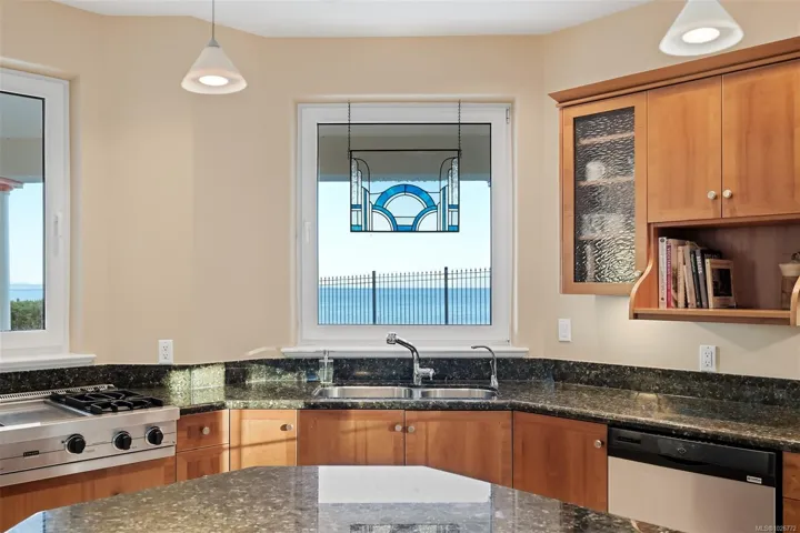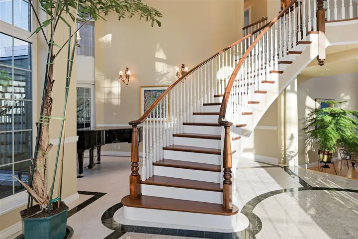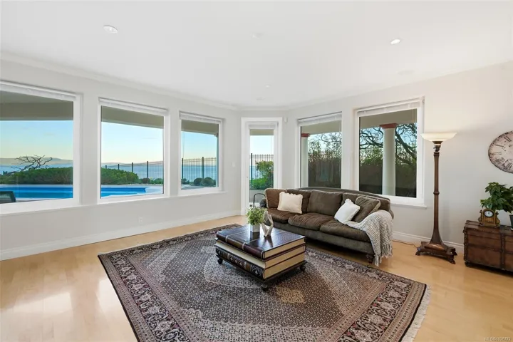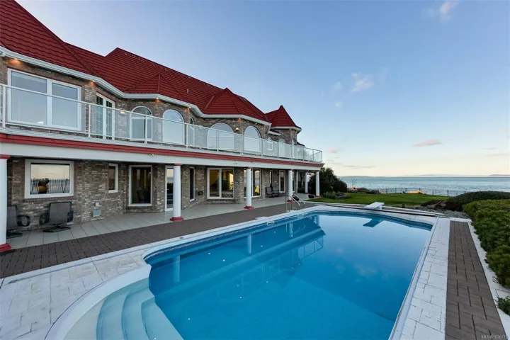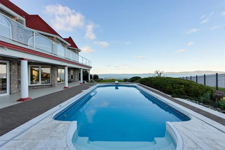 Quiet, solid bedrock, oceanfront with no bank erosion concerns & no public beach influence. Tucked away on a no through street. Lots of frontage & additional boulevard parking. Fully deer-fenced! Almost 6600 SF of living space + massive garage area comprises another 1000+ SF; truly a car-enthusiast’s dream. Exquisite Foyer, Piano Conservatory, formal DR & LR with 21-ft ceilings, surrounded in windows with a circular rotunda dome in the center of it all. 5 BRs, each with full ensuite. Library/Study up + unique office on main. FR right off pool deck. Media Room at the opposite end of the residence. Panoramic views over Salish Sea with ice capped Mt Baker & the Cascades Range front & centered in your outlook. Designed to perfectly sprawl over this .83-acre property while taking the most advantage of the view from each room. So close to the U-Vic. Telegraph Cove Beach, just a stroll from your front door, where you can enjoy the sand. Cadboro Bay Beach & Village is about a 15-min walk.