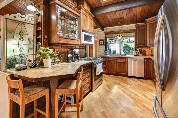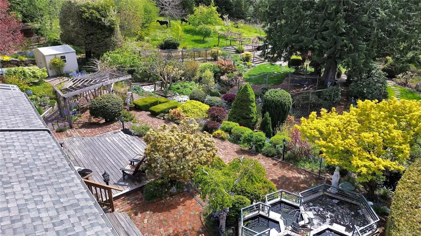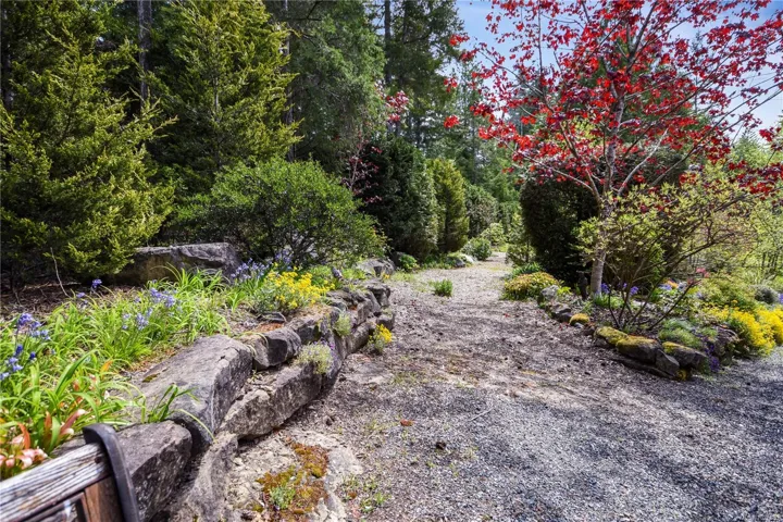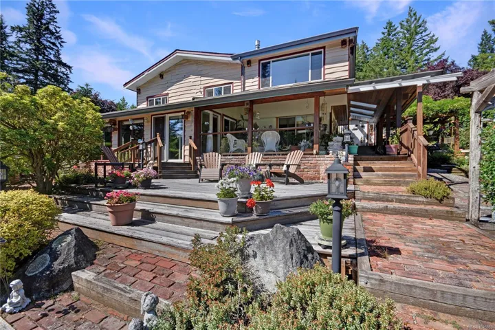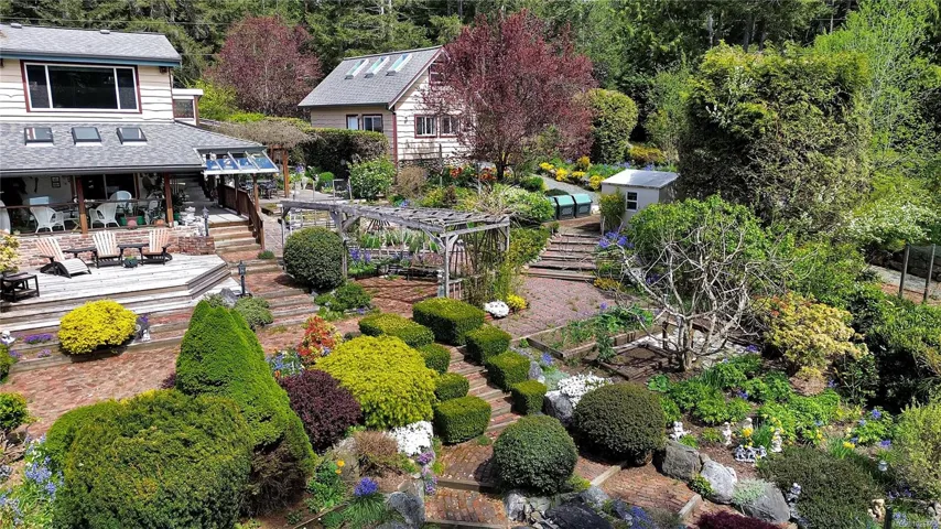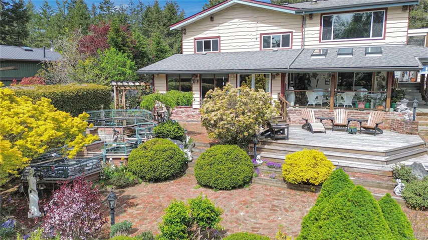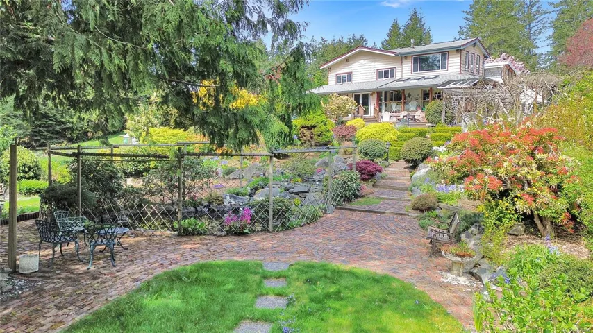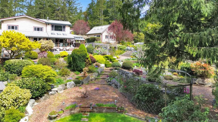 Discover this enchanting 1+ acre sanctuary on peaceful Gabriola Island. Fully fenced and exceptionally private, this property is truly a gardener’s delight. Abundant gardens, raised beds, mature plantings, koi ponds, and a tranquil water feature are complemented w/ brick pathways. Inside, vaulted ceilings and warm wood floors complement the bright, open-concept layout. Two cozy propane fireplaces add comfort and charm, while the gas stove makes everyday living easy. The seamless indoor-outdoor flow invites you to fully enjoy the surrounding landscape. The primary suite features a private sitting room or office — an ideal retreat for reading, working, or simply unwinding. Includes a heat pump, a newer septic system, 2 wells, and 3 cisterns. A detached garage with loft provides excellent storage, workshop, or studio potential. Relax under the grape arbour, harvest from your own beds, and enjoy the privacy and natural beauty — this is island living at its finest.