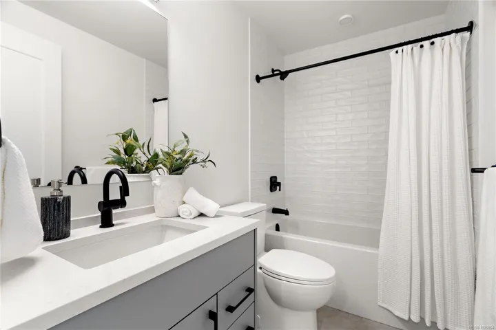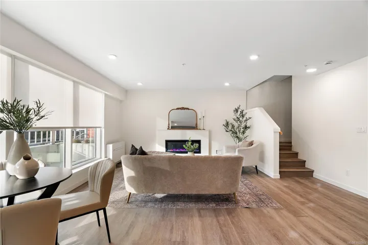 Move-in ready townhome at The Proxima! TH3 is a bright & spacious south-facing 2 level residence offering over 1,200 finished sq ft & own walk-up patio with separate entrance in the heart of Esquimalt Village. This thoughtfully designed home features 2 beds & 3 baths w/ an ideal layout that keeps the living & entertaining spaces on the main level while both bedrooms are situated upstairs. Expansive floor-to-ceiling windows flood the home with natural light, enhancing the open & airy atmosphere throughout. Interiors designed by Spaciz Design Co., the home is finished in the sophisticated Caligo colour scheme & features quartz countertops, an eat-in kitchen island, premium stainless steel appliance package, & a heat pump with cooling for year-round comfort. Located just moments from Saxe Point Park, local breweries, Esquimalt Market, shopping, and the Archie Browning Sports Centre, this home offers exceptional walkability and convenience. 1 parking stall & 2 storage lockers are included.