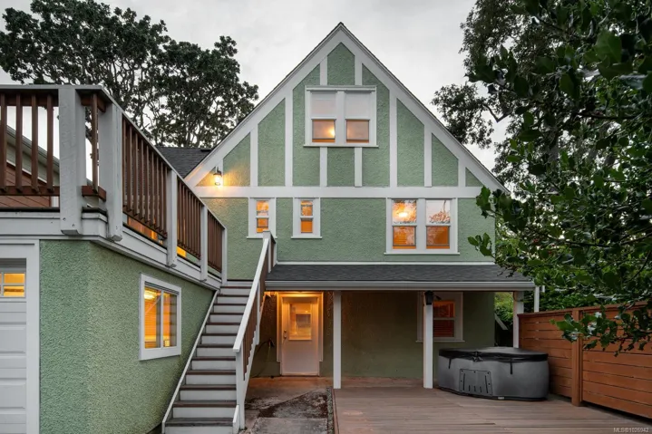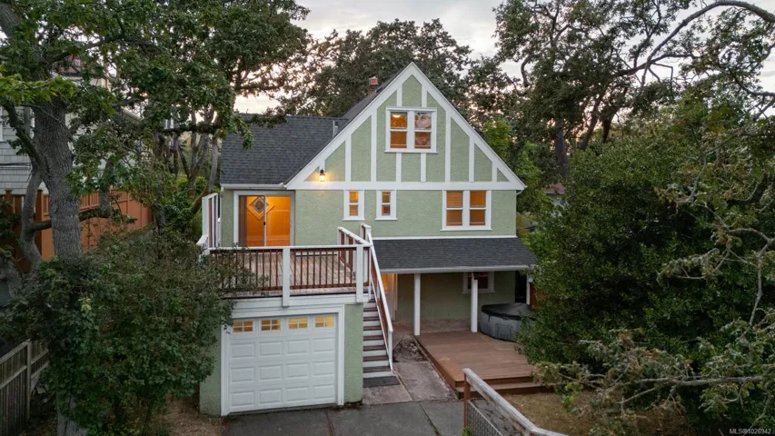 Welcome to 1959 Hampshire Rd, a beautifully restored character home in the heart of desirable Oak Bay. Offering nearly 3,000sqft. of bright, welcoming living space, this residence features 5 bds & 2 bths, blending timeless charm w/thoughtful updates. Richly refinished fir & oak floors w/mahogany inlays & stained glass accents showcase the home’s character, while the generous living room, anchored by a wood-burning fireplace, creates a warm & inviting gathering space. Step outside to enjoy 529sqft. of outdoor living across 3 decks, perfect for morning coffee, evening BBQ’s, or quiet relaxation. A wood burning stove provides cozy supplemental heat & abundant storage can be found throughout the home. Additional comforts include a hot tub, while a private electric gate opens to a quiet rear lane & attached garage. Ideally located just blocks from Willows Beach, Estevan Village, Oak Bay Village, close to Schools, this home offers a perfect blend of classic Oak Bay charm & modern-day living.