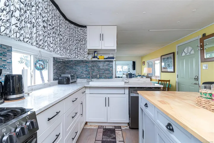 Wake up to breathtaking ocean and mountain views from this vibrant oceanfront park. Offering 3 bedrooms and 1 bathroom, this 920 sqft single-wide mobile home is full of character and coastal charm. Situated just steps from the beach, in Wells O’ Weary Park, 10 minutes from downtown Sooke. Spectacular coastal views from the picturesque wall of windows in the Sunroom. It’s like a live painting, capturing the colorful sunsets! Bright living room with a cozy woodstove. Spacious kitchen featuring stainless kitchen appliances, some shaker white cabinets, and an island with an eating bar. Three comfortable bedrooms and a 4-piece bathroom complete the interior, along with convenient in-unit stacker laundry. Outside leads to a sunny backyard with a seasonal creek, enjoyable sitting areas and a handy shed. Parking for two, plus nearby visitor parking. No age restrictions and pets welcome (1 dog & 1 cat, or 2 cats under 20lbs). Experience West Coast waterfront living at an affordable price.