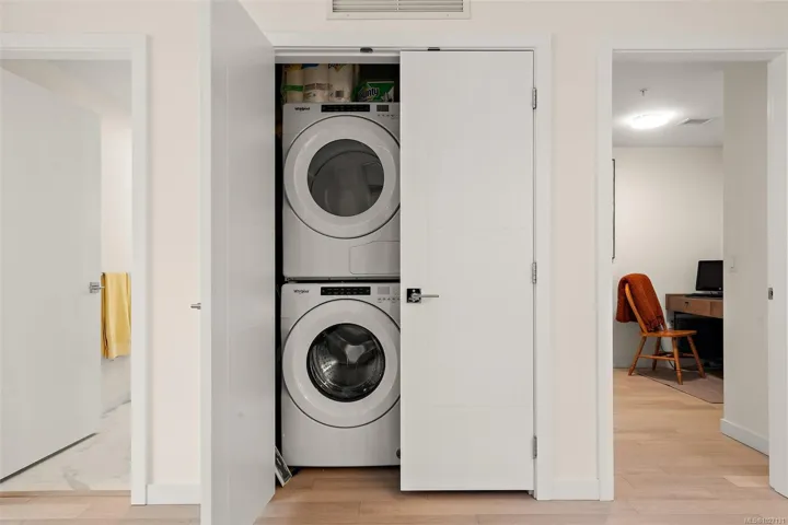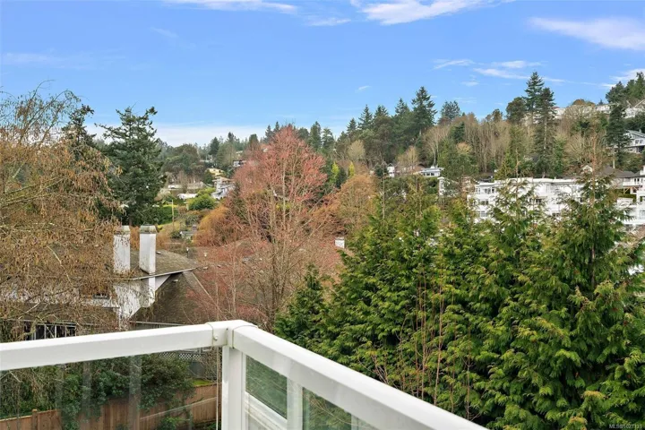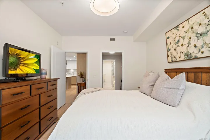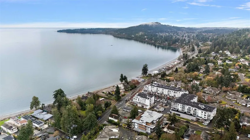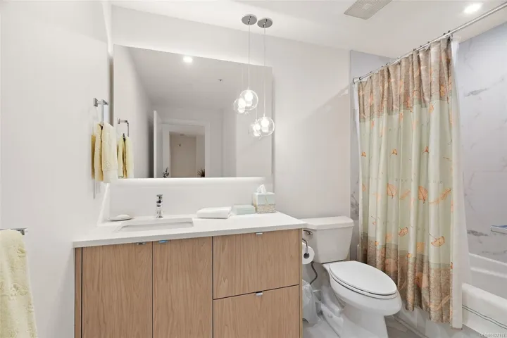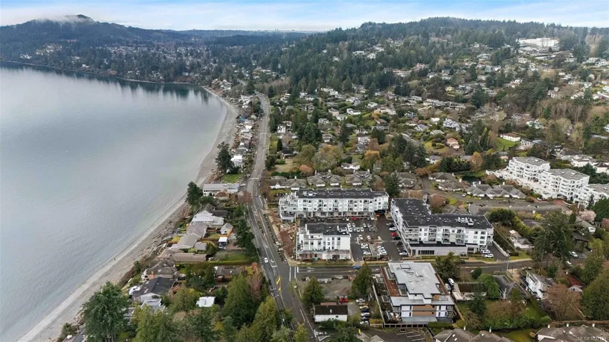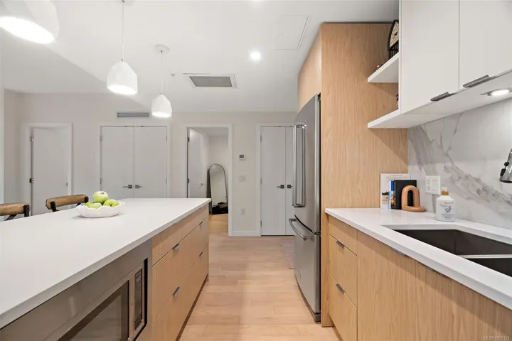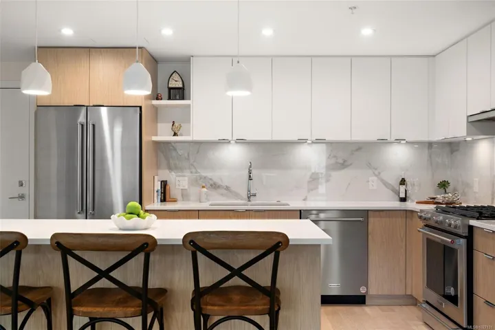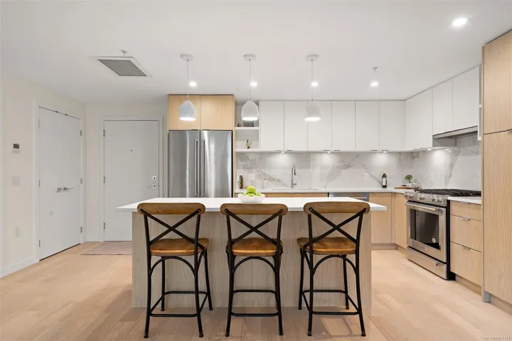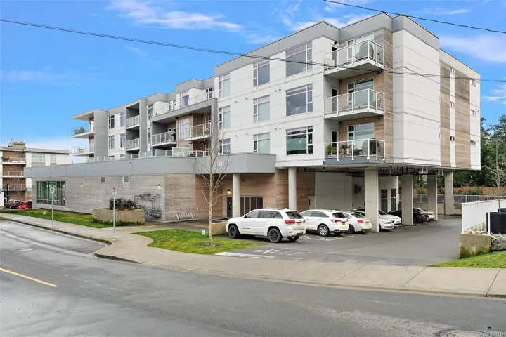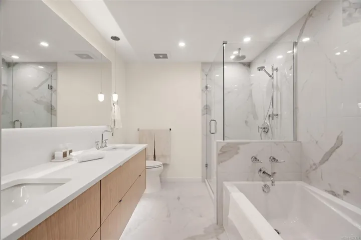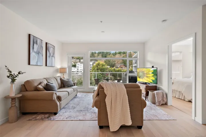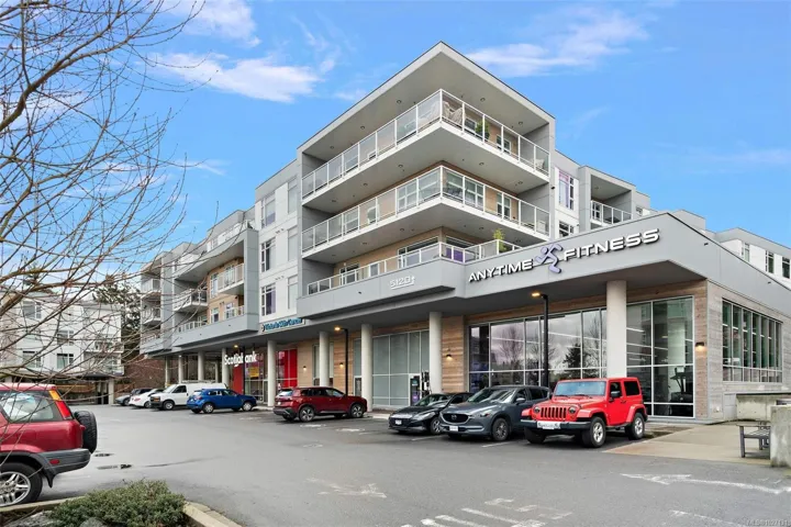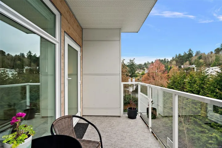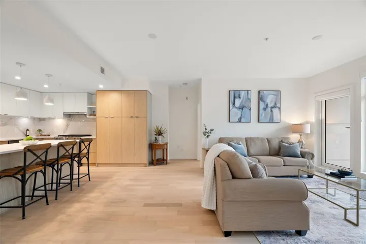 Welcome to Haro, a distinguished contemporary coastal residence offering seaside living in the heart of Cordova Bay. Quietly positioned within the building, this elegant home is illuminated by afternoon & evening light, expansive windows & a SW-facing balcony overlooking peaceful treetops. Inside, warm wood floors, soft coastal tones & 9-foot ceilings create an airy sophistication. The open-concept flows seamlessly into a beautifully appointed kitchen, complete with an oversized island, bar seating, and premium SS appliances, including a gas range—perfect for effortless entertaining. The 2 bedrooms are thoughtfully separated for privacy & options. The primary suite features a walk-through closet & a spa-inspired ensuite with heated floors, soaker tub, rain shower, and refined finishes. A versatile den offers space for an office or retreat. Secure parking, storage, pet-friendly, close to shopping, fitness studio, café, golf course, trails, bustling eateries & iconic Cordova Bay beach!