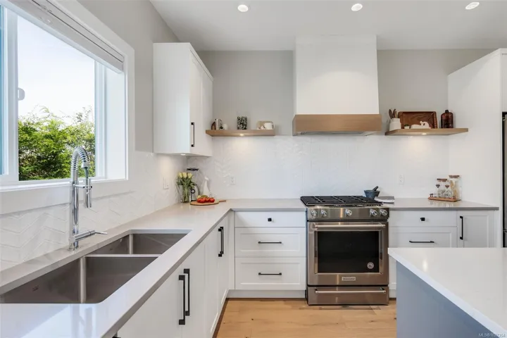 Built in 2021 and recognized with a 2022 CARE Award, this 3-bedroom, 3-bathroom plus den home showcases quality craftsmanship and timeless design. Located on a quiet side street with just four homes, this property offers privacy and community. The home offers a transitional style that blends classic warmth and modern finishes, with a bright, welcoming atmosphere throughout. The open main level features a spacious living area, a gourmet kitchen with quartz countertops and large island, a den/office, and a 2-piece bathroom. Upstairs are three bedrooms, a full laundry room, and a spacious primary with walk-in closet and luxury 5-piece ensuite. The sunny, low-maintenance backyard includes tasteful landscaping, irrigation, and a private patio. Additional highlights include a gas fireplace, heat pump with A/C, and double-car garage with adjoining mud room. Set on a flat lot near the Roost Farm Bakery and the airport trail, with easy access to Sidney and the ferries.