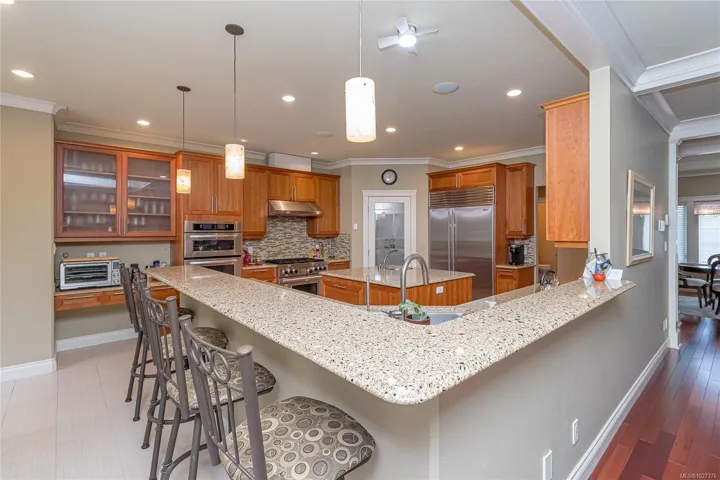 Grand custom-built rancher in a sought-after Chemainus neighbourhood just steps to the ocean and a short stroll to Malcolm Beach. This spacious 3-bedroom, 3-bath home features an inviting open-concept design centered around a gourmet kitchen with high-end Wolf and Sub-Zero appliances, quartz countertops, and an exceptional layout for entertaining family and friends. Rich Brazilian cherry hardwood and tile floors are warmed by in-floor radiant heat and complemented by elegant 9-ft coffered ceilings. The generous primary suite offers an elaborate ensuite with rain shower and soaker tub, along with his and hers walk-in closets fitted with custom cabinetry and organizers. Enjoy ocean views from the property and make the most of the outdoor kitchen patio and gazebo for effortless summer gatherings. Plenty of parking, including dedicated RV space, ensures practicality. Rural in feel yet connected to city water and sewer, this is refined West Coast living in beautiful seaside Chemainus.