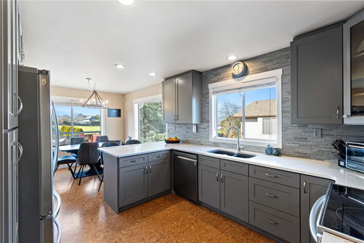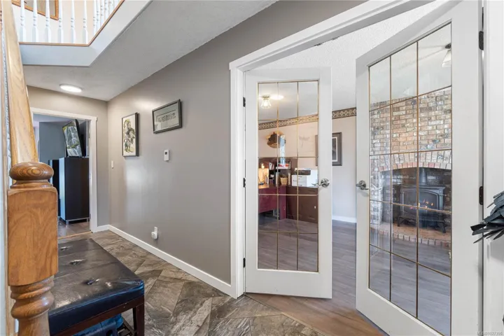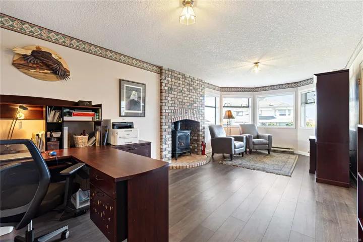 Family homes with ocean views in a quiet North Nanaimo location are rare. Enjoy the heated tile floors when entering and the large family room on the right down the hall to a bedroom/bathroom combination (a mortgage helper?) and a media room featuring a patio door to the private yard plus a laundry room and a double car garage. The main level has three bedrooms the ensuite with heated tile floors. The living room has a fireplace and panoramic windows to enjoy the ocean views. The rising sun silhouettes Vancouver, and its buildings reflect the setting sun. The updated kitchen features stainless steel appliances, solid surface counters, with access to a deck to enjoy the evening sun, with a view of the coastal mountains. The roof is 8 yrs old and has copper plumbing. Most of the house is heated with a gas “woodstove” and fireplace. A great location for families, adjoining a laneway into Groveland Park, a short walk to the ocean front. Measurements approximate buyer to verify.