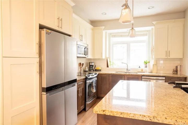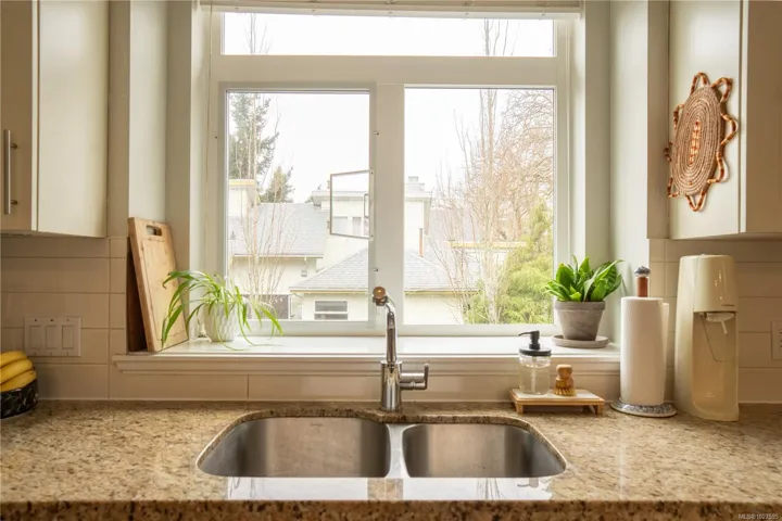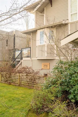Lansdowne Walk is a boutique collection of 7 Arts & Crafts style townhomes set among mature landscaping & tree lined streets. This desirable end unit enjoys extra surrounding green space, a feature unique to this home. Impeccably maintained, the 3-bed, 3-bath home offers a bright open main floor with 9-ft ceilings, while a bay window & a full wall of extra height windows fill the home with natural light from top to bottom. The kitchen features granite countertops, stainless steel appliances & an eating bar, while the living area opens to a south facing sundeck. Private stairs link the sundeck to the patio below, creating inviting outdoor spaces for relaxing or entertaining. Upstairs, the primary & 2nd bedroom share a full bathroom. The entry level includes a 3rd bed rec room, 4-peice bathroom & access to a covered patio. Ideally located near shopping, schools, Camosun College, UVic, golf and on a bus route, this home offers comfort and convenience in a sought after neighbourhood.