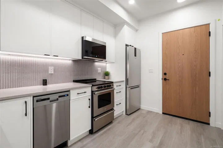 Step into comfort and contemporary living in this thoughtfully designed condo, where every detail has been curated for ease and enjoyment. The modern kitchen is both stylish and functional, showcasing Whirlpool appliances, a tiled backsplash, and a smart bar seating area that invites casual meals and conversations. The bathroom features a tiled shower complemented by in-floor heating—perfect for slow mornings and relaxed evenings. Full-size stackable laundry, air conditioning, and window screens add everyday convenience, while blackout blinds in the bedroom create a peaceful retreat for restful nights. Step outside and take advantage of the excellent gym and inviting courtyard—ideal spaces to recharge, socialize, or simply enjoy a quiet moment outdoors. Located in the heart of Esquimalt. The ocean, downtown area, Naval base and shopping are nearby. This home effortlessly blends comfort, function, and lifestyle, offering a welcoming space you’ll be proud to call your own.