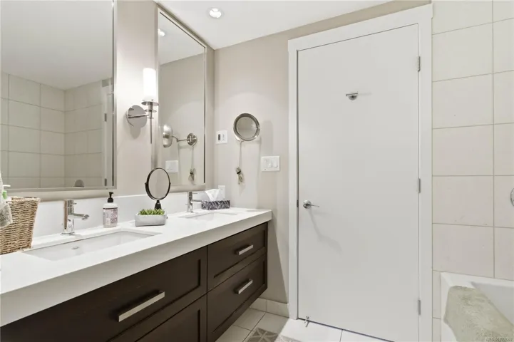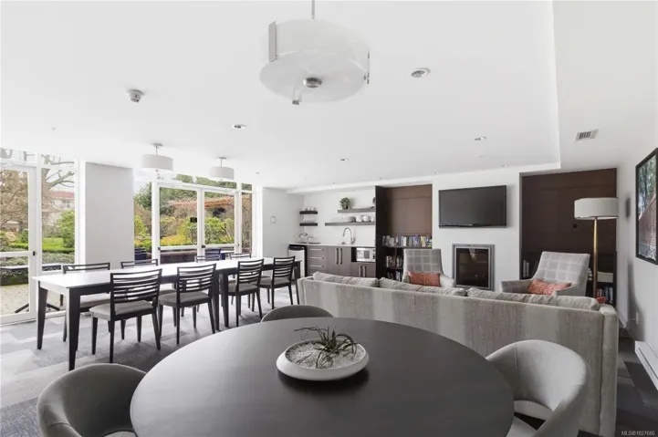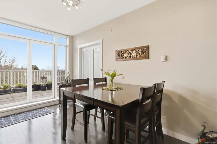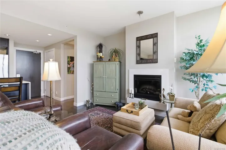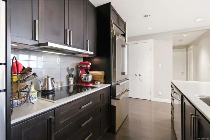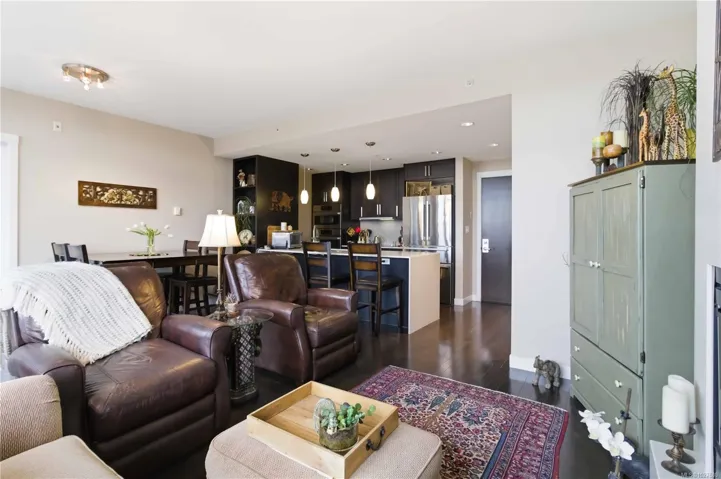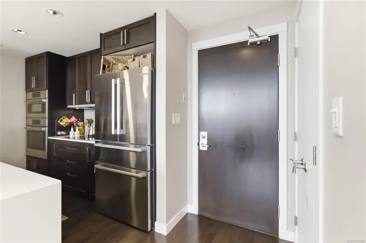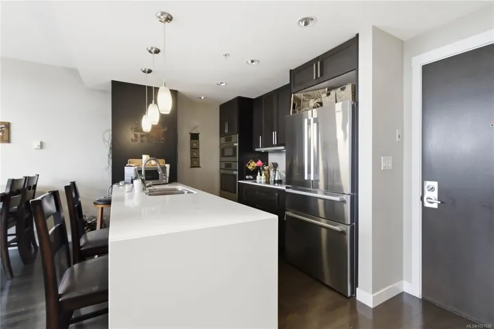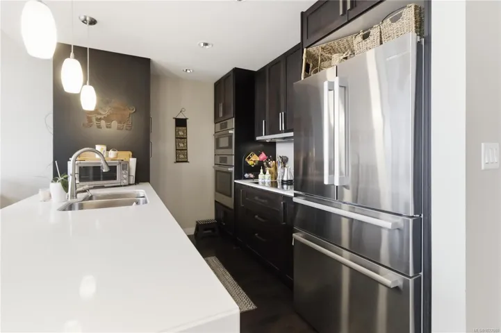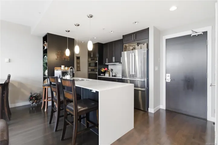 STEEL/CONCRETE built by Concert Properties. Sub Penthouse 1 Bed+Den, 2 Bath home with a massive SOUTH FACING 780sqft Patio offering OLYMPIC MOUNTAIN & OCEAN VIEWS! The unit acts as TOP FLOOR and is just under 1000sqft offering hardwood floors, open floor plan with a chef’s kitchen inc; quartz countertop peninsula island, wall oven, wall microwave, double door fridge with double door freezer, dining area with spacious living area including electric Fireplace. The natural lighting from your multiple LARGE WINDOWS is evident throughout. Den space is perfect with large windows for your office or a spare guest bed or hobby area. The bedroom has ample closet space, will fit a king-sized bed as well as bedroom furniture and the ensuite bath has a walk-in shower, soaker tub, his/her sinks and heated flooring. The main bath is a 2 piece and you have a full laundry room with storage capabilities. The building offers a Meeting Room, Gym, Underground EV installed Parking Stall and a STORAGE LOCKER