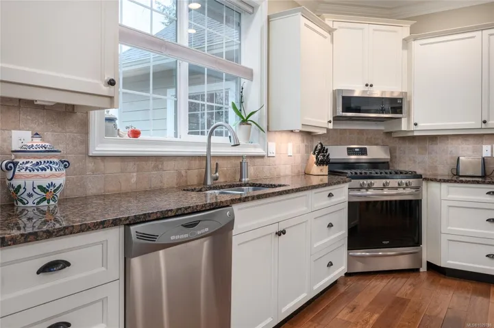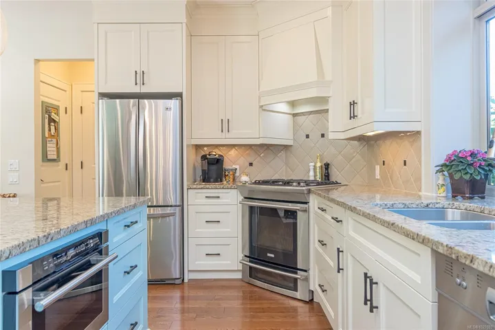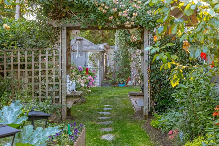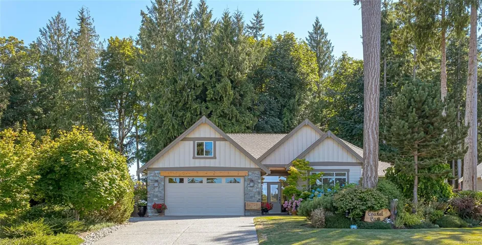 Gorgeous TODSEN built executive rancher tucked away on .49 acre located in Lighthouse County. One of the nicest lots in Nile Landing, with ocean glimpses & the beach just a short walk away, offering easy access to local shopping& amenities! This open-concept 3-bedroom + 2-bath home is filled with light from floor-to-ceiling windows and skylights. It boasts an 11′ tray ceiling in the great room, a cathedral ceiling in the bedroom/den/office with a built-in desk & custom murphy bed w/shelving, engineered hardwood floors,&carpeted bedrooms throughout. A deluxe kitchen with granite countertops, island w/breakfast bar, custom cabinetry, pantry closet & quality appliances. The dining room doors open onto a private patio with south-facing views in a park-like setting. The covered patio has skylights & a propane BBQ connection. A fenced gardener’s paradise yard w/raised beds & an arbour gate to the forest & creek below. This home is completed with a heated double-car garage with keyless entry.