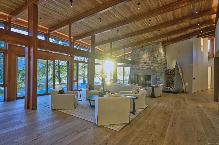 Characteristically west coast with its Douglas Fir exposed structure, the house differs from the norm through a masterful use of curved lines. The undulating roof mirrors the gentle curves of the island’s landforms, while the curved backbone of the home follows the curve of the point. The point house is effortlessly accessed by boat, float plane, or ferry from Vancouver. An ideal corporate retreat or family legacy property.