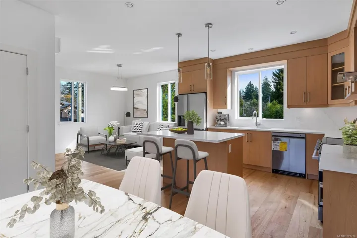 Open House Sunday 11-12:30. Brand new 4-unit townhome development in the heart of Gordon Head at 1559 Ash Road. Thoughtfully designed 3 bedroom + office, 4 bathroom homes offering approx. 1,990 sq ft of finished living space across three levels. The main floor features engineered oak hardwood, quartz countertops, oversized island, LG stainless appliance package, electric fireplace and abundant natural light. Upstairs offers spacious bedrooms including a primary retreat with walk-in closet and ensuite. The lower level includes a versatile flex/bonus room, full bath and single-car garage. Built with R-40 insulation, heat pump with HRV, double-pane windows and quality Hardie board exterior. 2-5-10 New Home Warranty. Close to parks, trails, recreation centres, UVic and just minutes to shopping and amenities. Exceptional value per sq/ft.