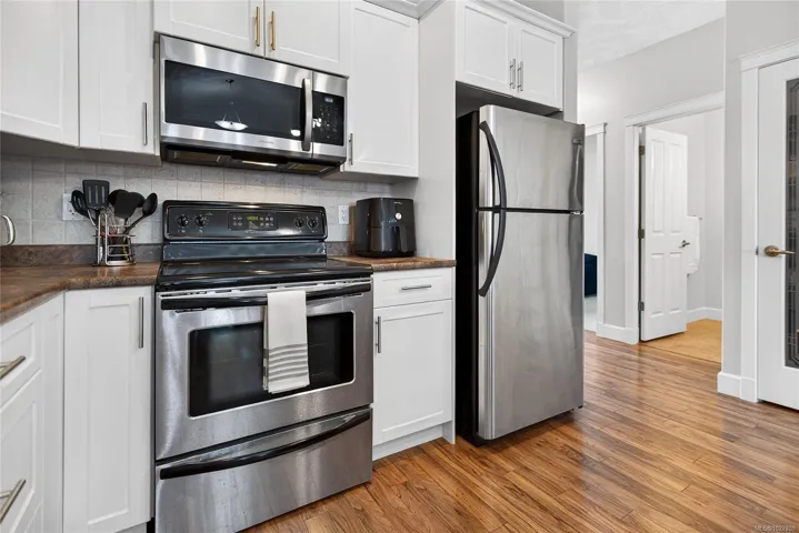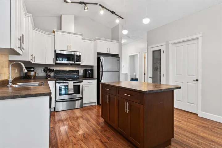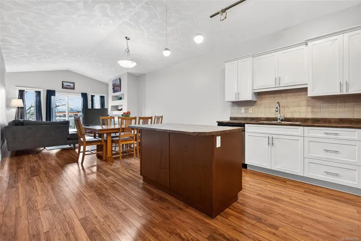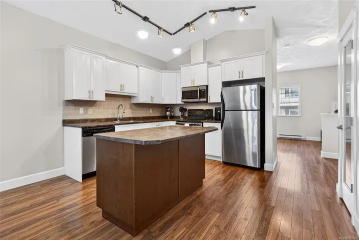 Move in ready!! WeII designed, gorgeous mountain views and fresh paint throughout! This 2-bedroom, 2-bath townhouse is 1200+ sq ft and conveniently located just minutes from schools, parks, North Island College, CFB Comox, hospital and shopping. Step inside to a warm and inviting open-concept living space with vaulted ceilings and great open concept floorplan. The kitchen is bright with white cabinets and extensive storage and open to the living and dining space. The living room boasts a cozy electric fireplace with ample space for every day living and entertaining. The sliding glass door leads you to a generous deck for easy barbeque access or just outdoor space to relax and take in those incredible mountain views! Both bedrooms are generous in size and the primary bedroom features lots of storage, a 3 piece ensuite and again the mountain views! This pet-friendly complex has no age or rental restrictions and includes a covered carport stall