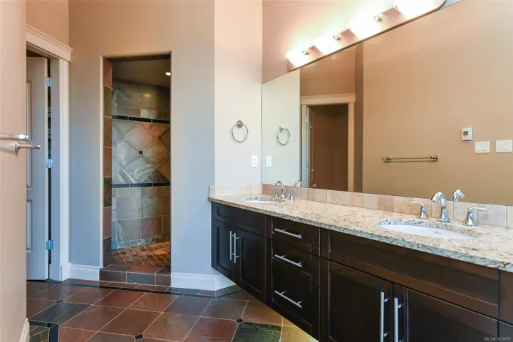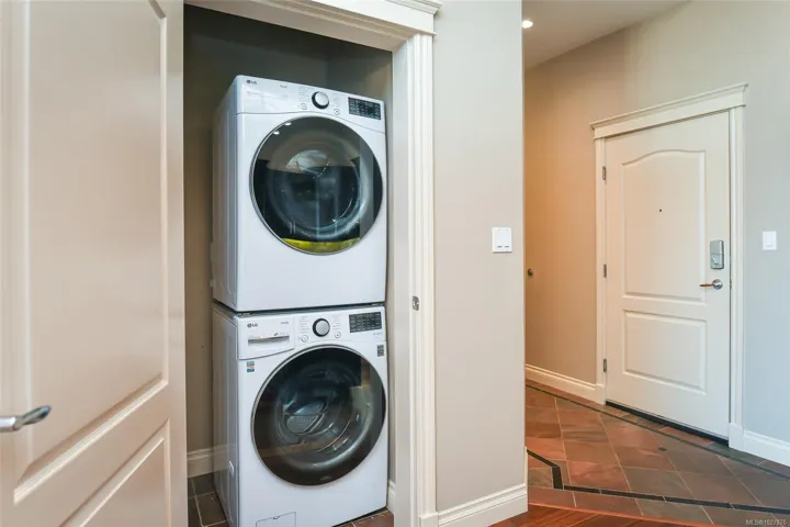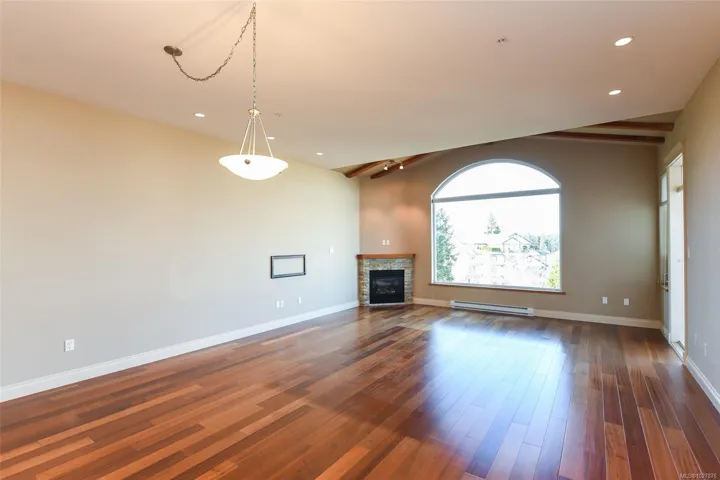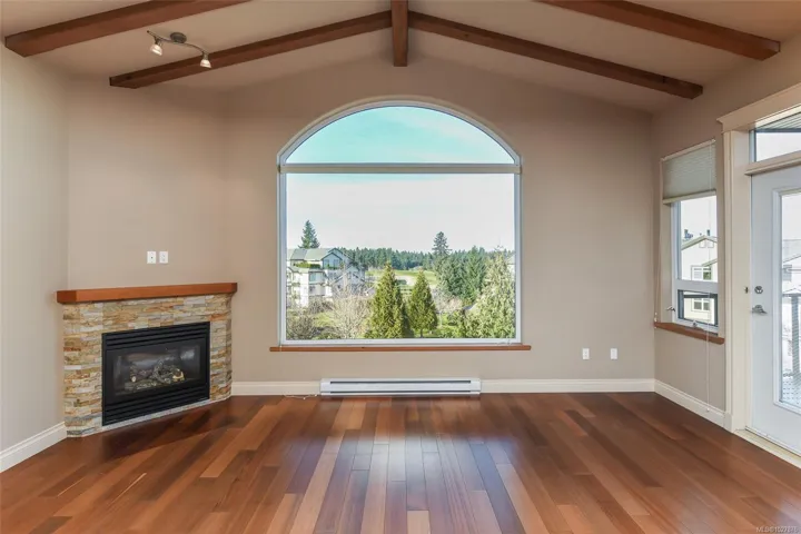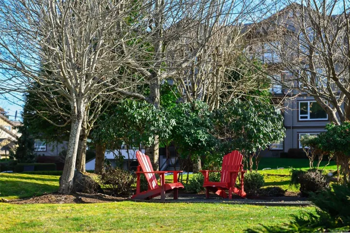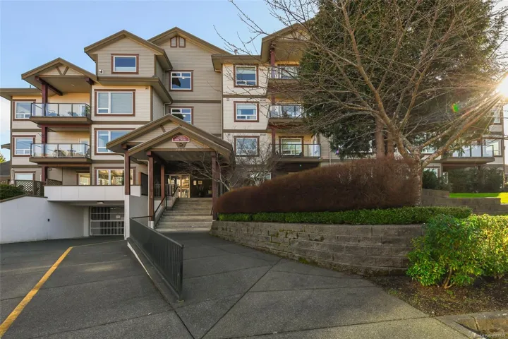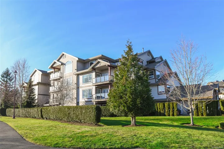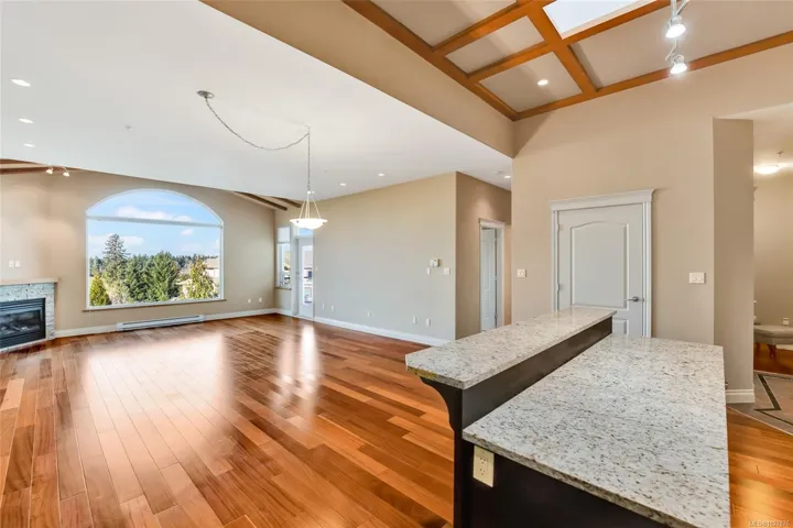 A beautiful place to call home at Crown Isle Golf Course. This stunning penthouse-level 2-bedroom + den, 2-bathroom condo offers refined West Coast living with lovely architectural detail. Soaring 12-ft cathedral and tray ceilings with skylights create a bright, elegant atmosphere. The open-concept design features a gourmet kitchen with granite counters, dark cabinetry, and a spacious island flowing into the dining and living areas. Two natural gas fireplaces provide warmth and ambiance. The generous primary suite boasts a luxurious ensuite with tiled shower and double sinks. Step onto the large north-facing deck overlooking the beautifully landscaped courtyard garden. Views of the golf course and water feature – Courtyard garden ideal for relaxing. Complete with secure underground parking & storage locker. Plenty of exterior parking. Quick access to the clubhouse, gym (with membership), and dining options. Close to shops, restaurants, community pool, college& hospital