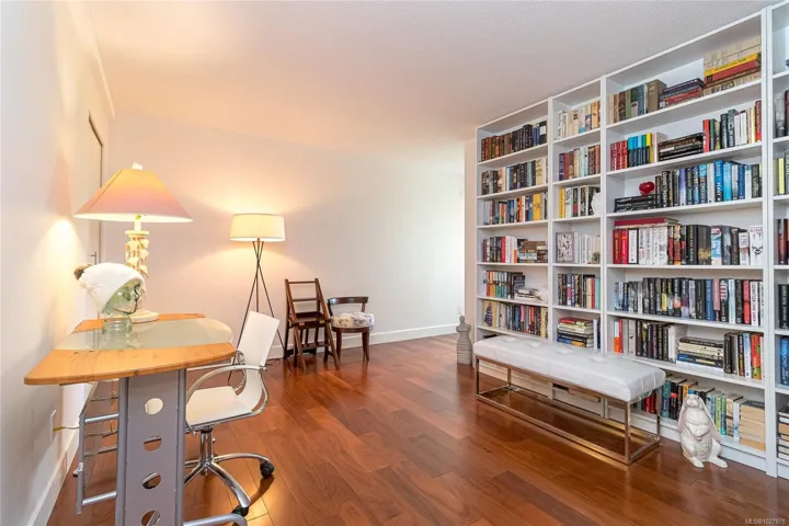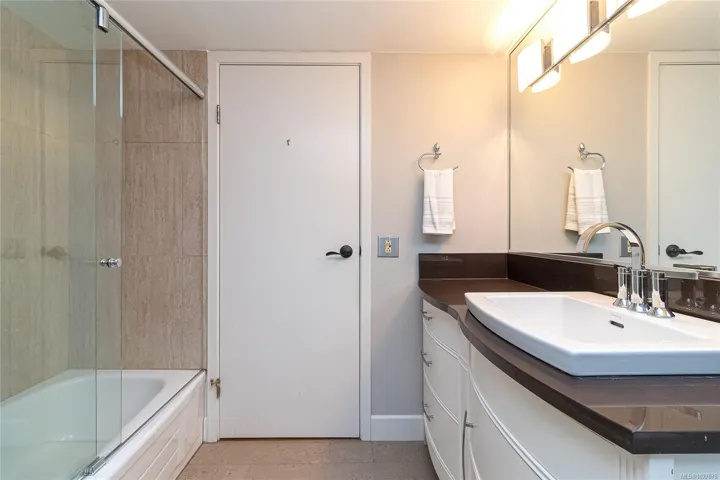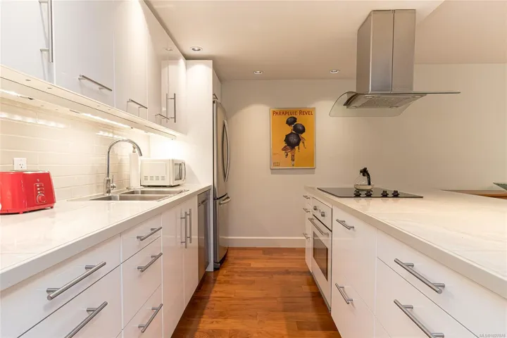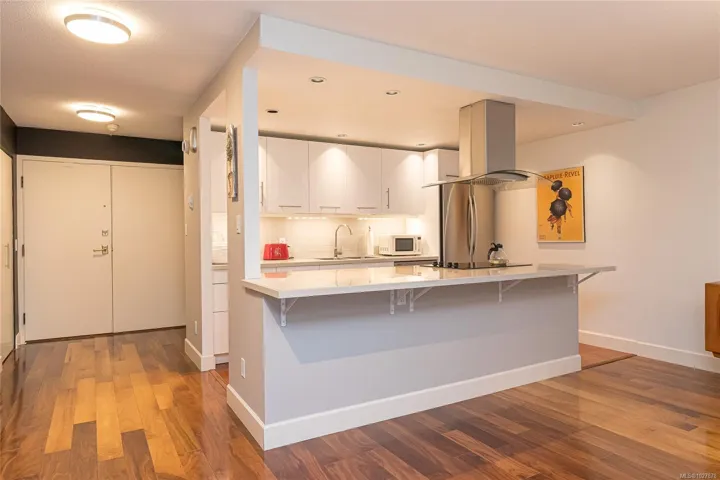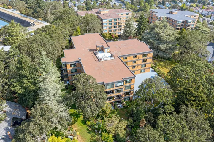A stunning corner unit with beautiful views at Spencer Castle! Warm hardwood flooring welcomes you into this spacious 2-bedroom, 2-bathroom condo featuring bright Western & Southern exposures that fill the open-concept living & dining areas with natural light. The enclosed west-facing balcony is ideal for a small starter garden. The modern kitchen is designed for both style and function, offering a double-wide island with a built-in ceramic cooktop, a large overhead range hood. The suite includes two full 4-piece baths, including a primary ensuite finished with elegant marble tile and countertops. Additional features include a centralized hot water heating system, in-suite laundry, designated parking, and two separate storage lockers. Residents also enjoy access to the pool and the castle amenities. This solid concrete and steel building sits on beautifully maintained grounds near Hillside and Mayfair Mall, Cedar Hill Golf Course and Recreation Centre, and Summit Park.