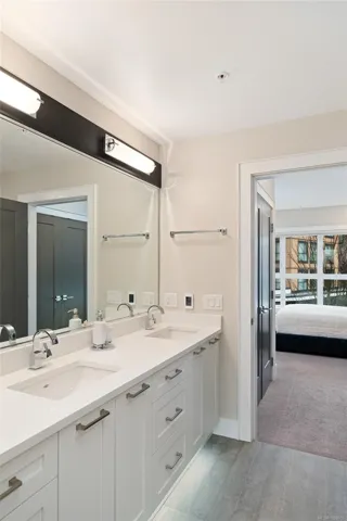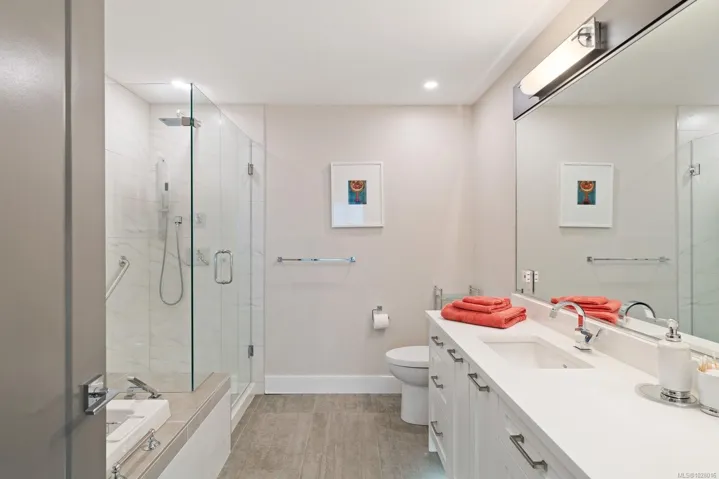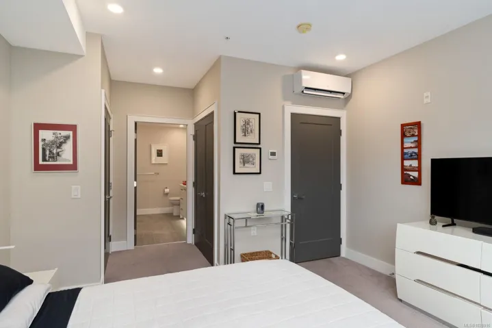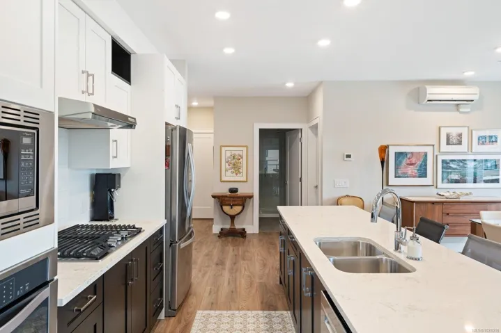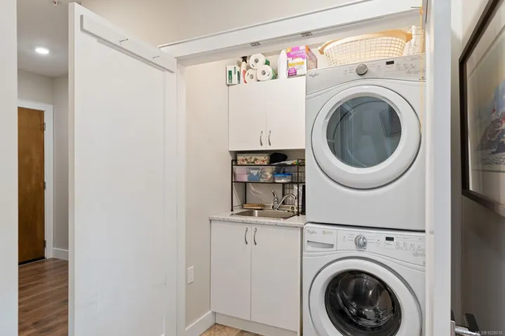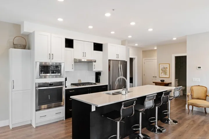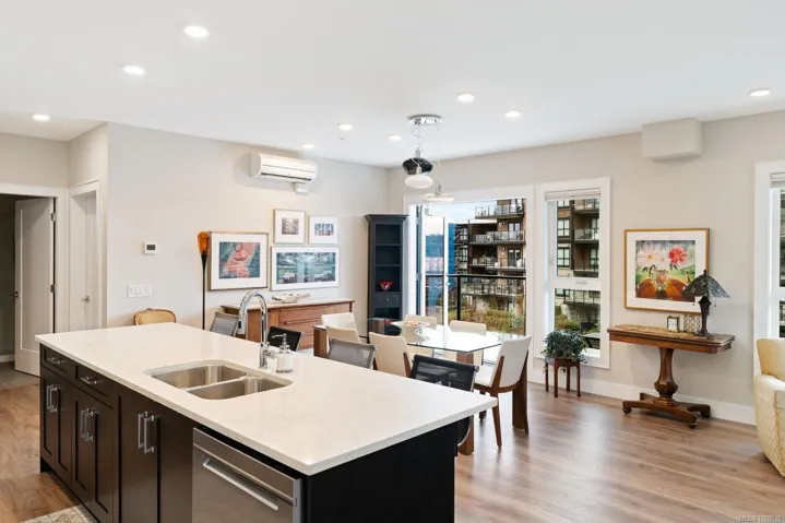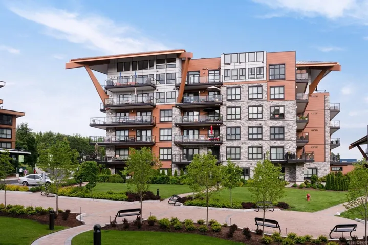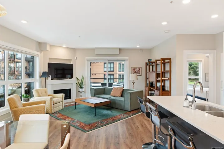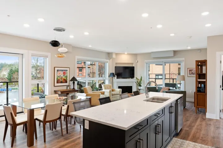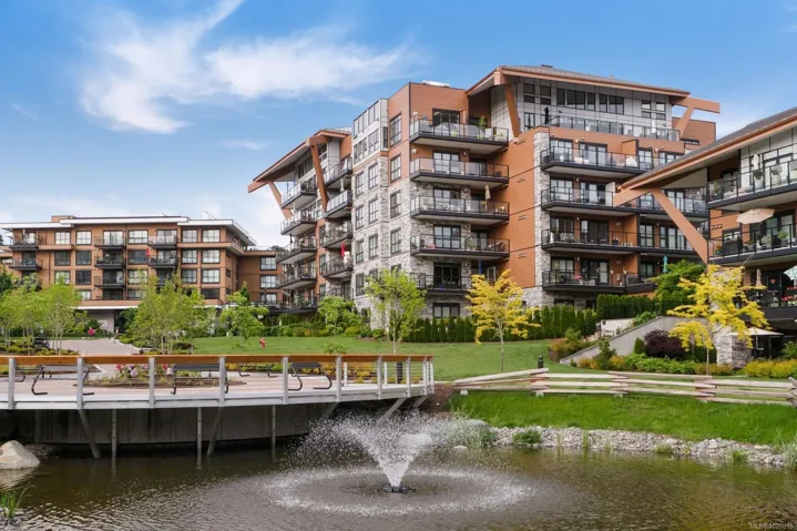 Like-new corner residence at Travino offering 1,335 sq.ft. of bright, refined living w/ 2 beds, 2 baths + den. One of the most desirable layouts w/ well-separated bedrooms & a spacious open-concept living & dining area. Step onto the impressive 312 sq.ft. wraparound deck w/ westerly exposure overlooking beautifully landscaped grounds. The chef-inspired kitchen features quartz counters, a large island, gas range, built-in wall oven, & ample cabinetry. Modern finishes, & a cozy gas fireplace create a warm, elegant space ideal for relaxing or entertaining. The generous primary offers a luxurious 5-piece ensuite w/ soaker tub & separate shower. Includes underground parking w/ EV charging & storage. Residents enjoy exceptional amenities incl rooftop patio, gym, games room, bike storage, dog wash station, & lounge w/ kitchen. Award-winning Built Green Gold Certified w/ solar-assisted HVAC & hot water included in strata fees. Steps to shops, parks, trails, & transit. Simply move in and enjoy!