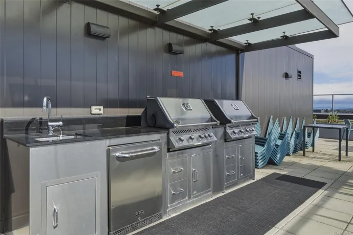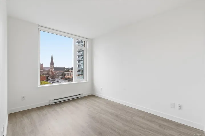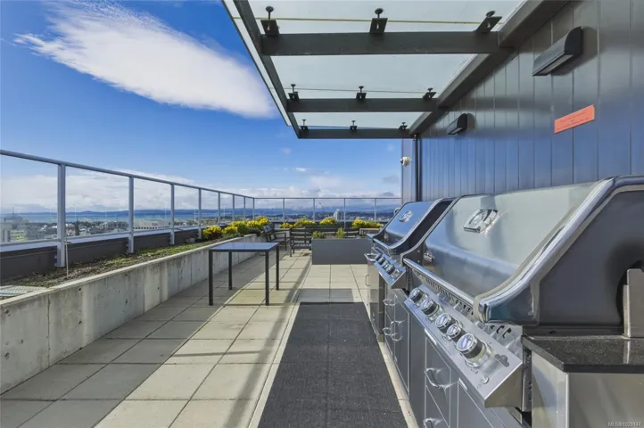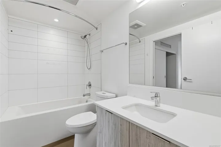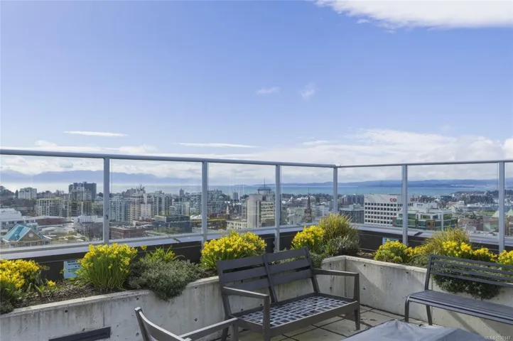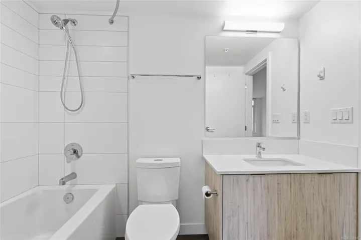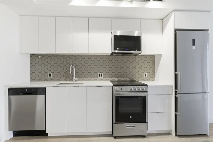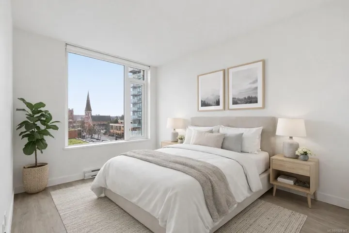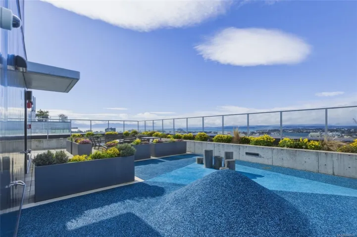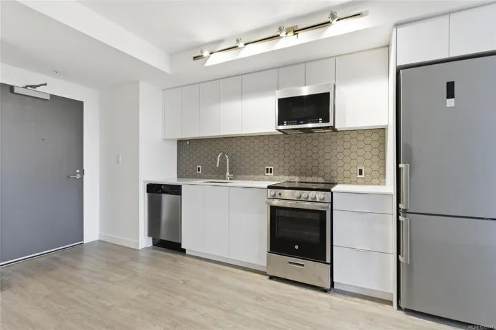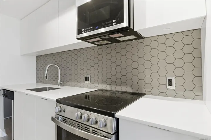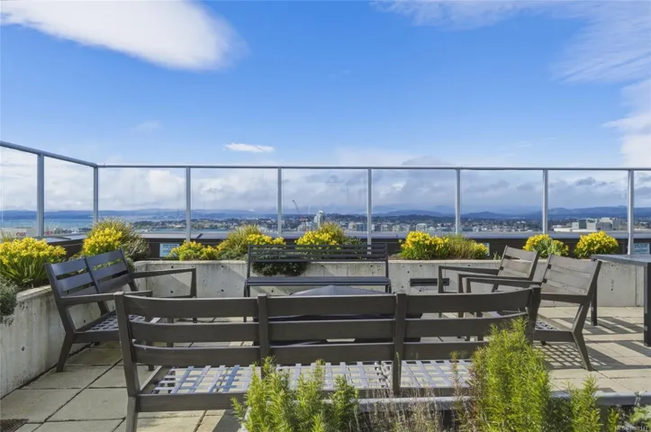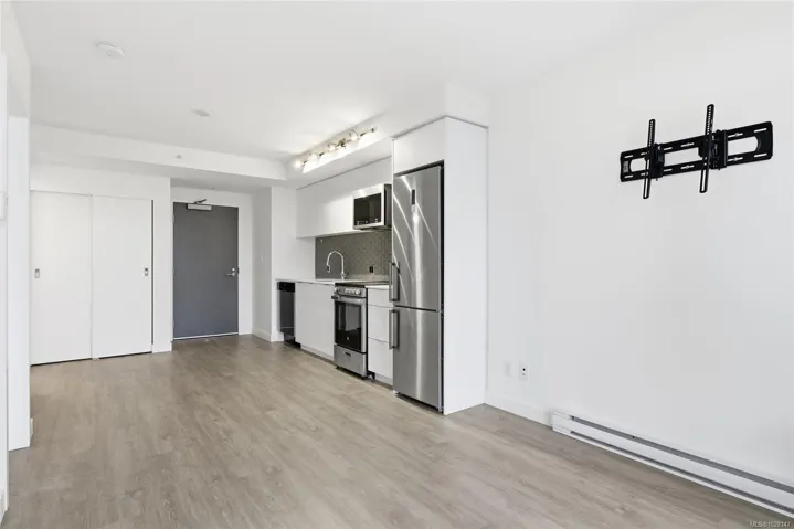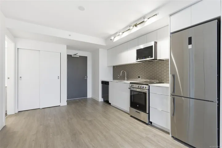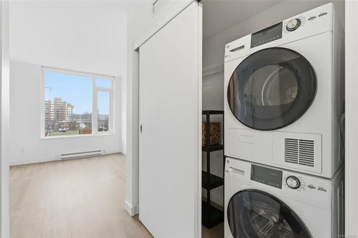Gorgeous, bright 8th floor 1 bedroom + 1 bathroom condo that shows like new, offering beautiful city views and an efficient, contemporary layout. The modern one-wall kitchen features immaculate cabinetry, quartz countertops, a full-height backsplash, and stainless steel appliances including fridge, stove, dishwasher and over-the-range microwave. The spacious bedroom includes closet space with in-suite washer and dryer, and convenient access to the sleek bathroom. Building amenities include a secure storage locker and bike pedestal, rooftop patio with BBQs with beautiful ocean views and a pet wash station. The balance of the 2-5-10 New Home Warranty remains for added peace of mind. A fantastic opportunity to own a move-in-ready home with modern finishes in the heart of Downtown Victoria.
