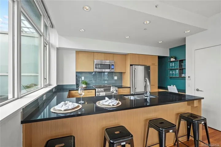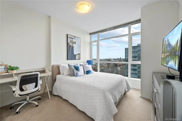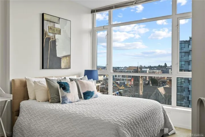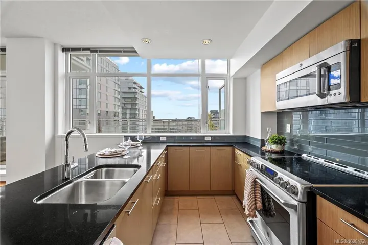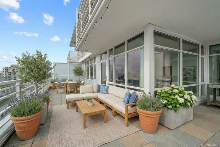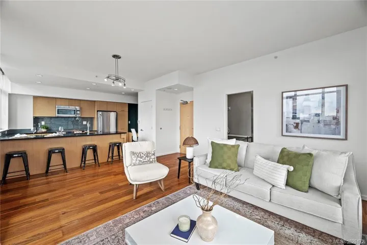 Beautiful OCEAN, Olympic Mountain, and City views from this sub Penthouse! Floor-to-ceiling windows and sunny south exposure fill the home with light. Spectacular views sunrise to sunset from your kitchen, living room or massive (460 sqft)wrap around deck with gas and water hookups. Corner suite with open layout featuring: 2 balconies (virtually staged), warm hardwood floors, 9′ ceilings, bathrooms with in-floor heating, stylish kitchen with granite countertops, ss appliances, and bar nook. The spacious Primary boasts walkthrough double closets and spa-inspired ensuite. 2 dogs/2 cats or 1 of each allowed. Highly secure building with: a well managed strata, rooftop patio, media room, underground parking, bike storage, and storage locker. Steps to Inner Harbour, markets, cafes, Victoria culture scene, gyms/yoga studios, world-class dining + easy access to nature trails, beaches/boat launches and direct buses to Uvic. Priced to sell and ready to impress!