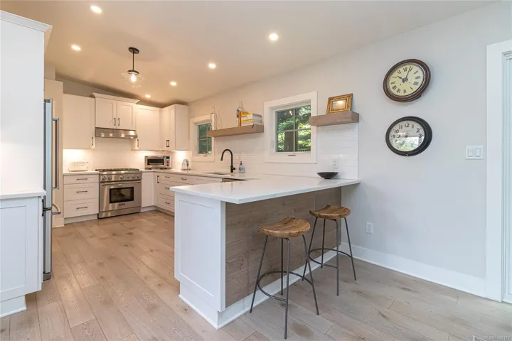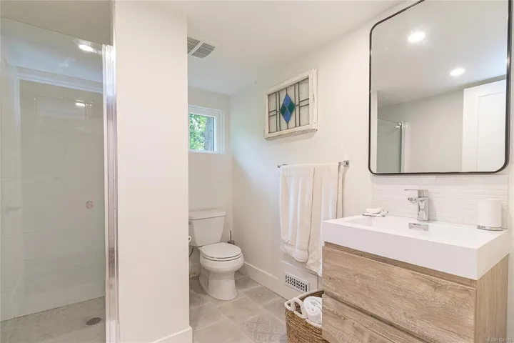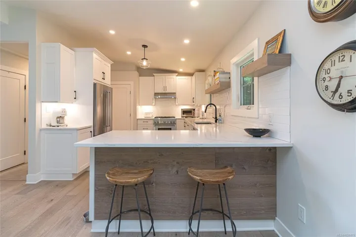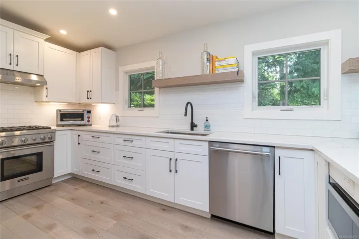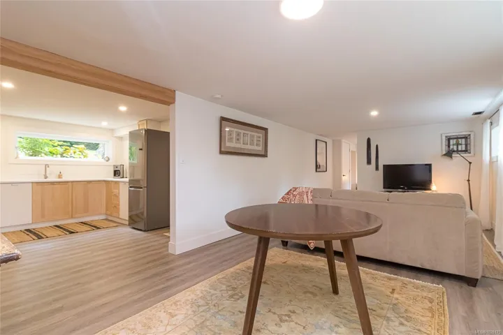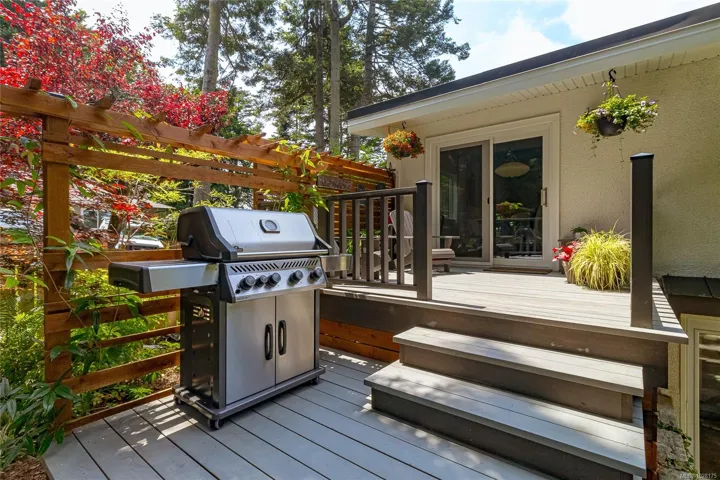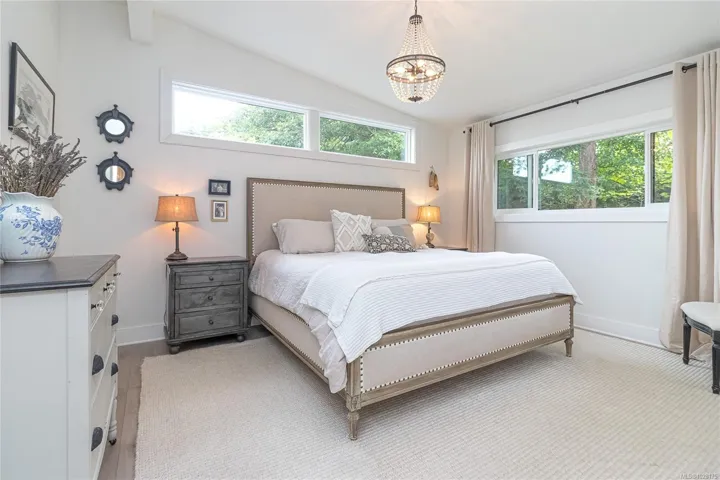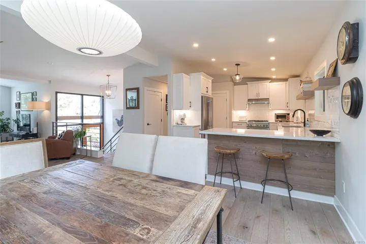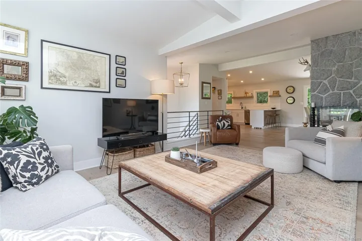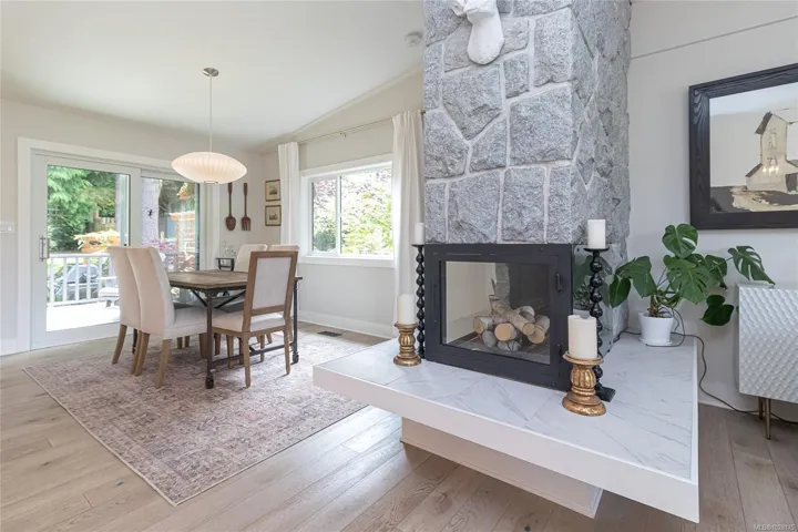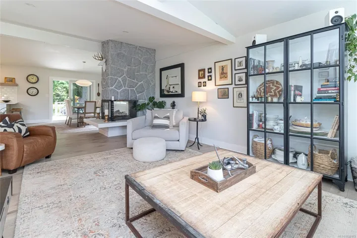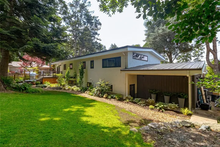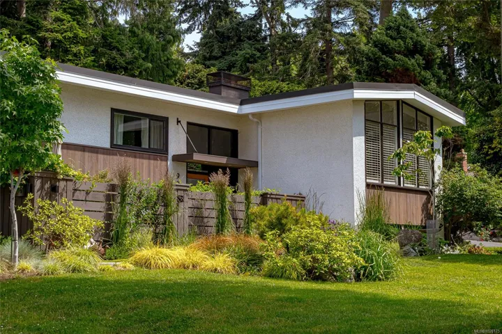 Tucked away in one of South Oak Bay’s most coveted neighborhoods on a quiet cul-de-sac, this beautifully updated mid-century modern family home offers timeless appeal just steps from the Oak Bay Marina, Oak Bay Beach Hotel, and Victoria Golf Club. Thoughtfully updated from the exterior to interior including new floors throughout and a newer kitchen with stainless appliances, blending modern convenience with classic charm. The main level offers an ideal layout with spacious living and dining areas and four bedrooms—including a rare primary suite with walk-in closet and full ensuite. Vaulted ceilings lend architectural interest and a bright, airy feel. The finished lower level provides additional versatility with a cozy family room, guest space, another bedroom, and full bath. A gas furnace ensures efficient comfort, while a garage/carport adds practicality. Set on a lush, 10,826 sq. ft. lot with mature landscaping and vibrant flowering gardens with entertaining areas front and back!