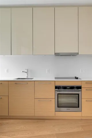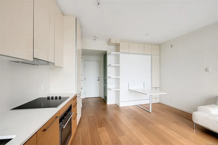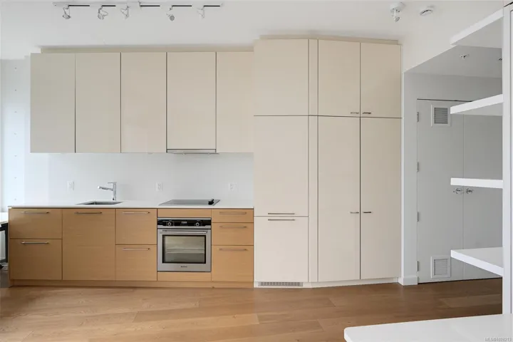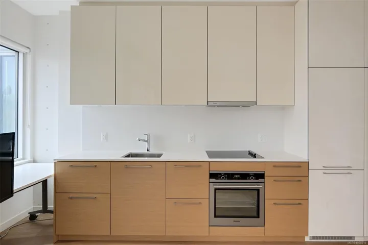 Large windows fill the space with natural light and showcase views toward the Inner Harbour and vibrant city skyline, while the private balcony offers the perfect place to take it all in. The modern kitchen features quartz countertops, quality cabinetry, and premium built-in appliances.