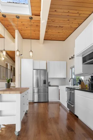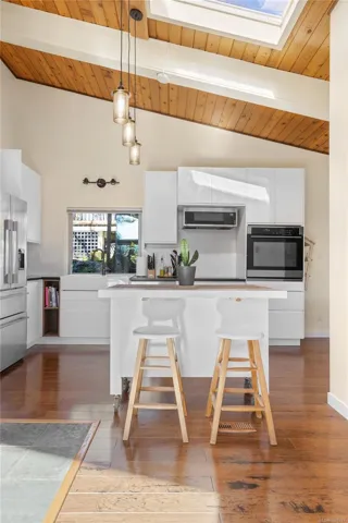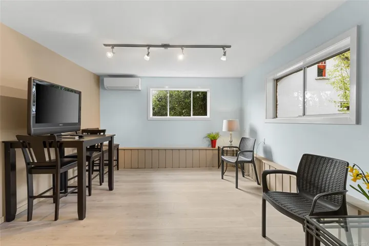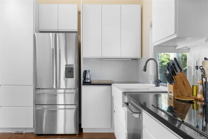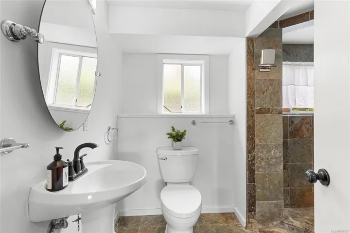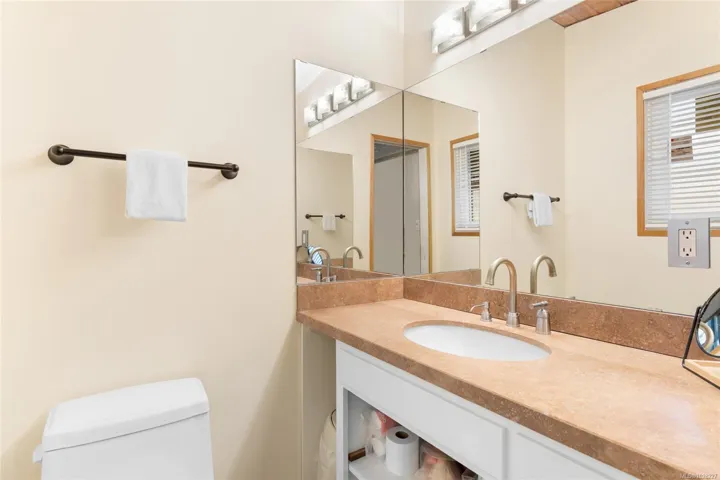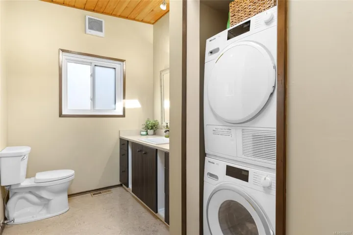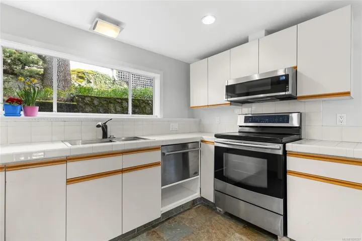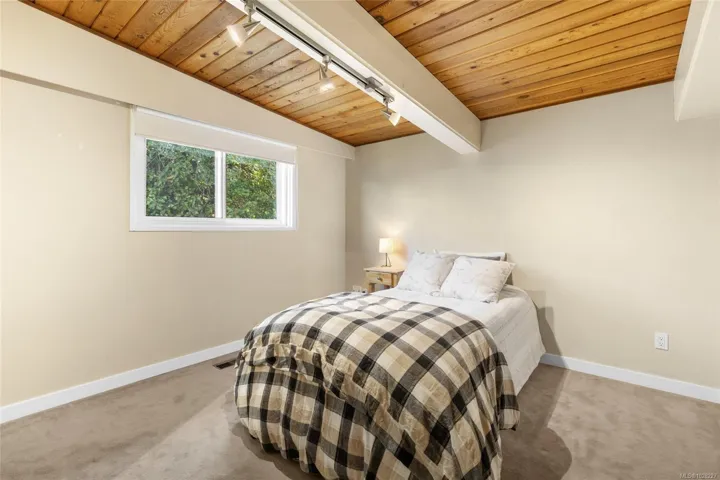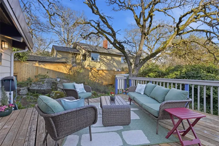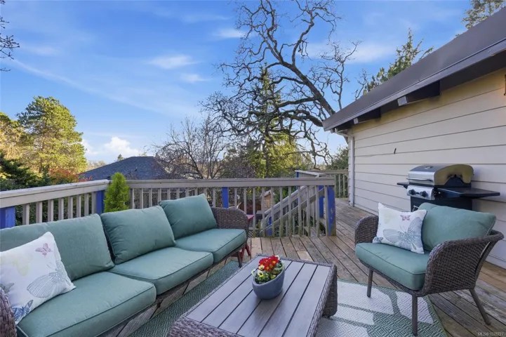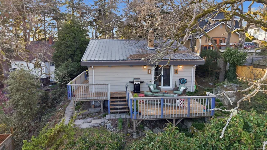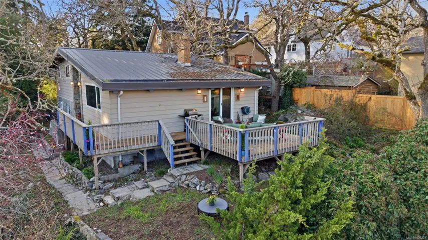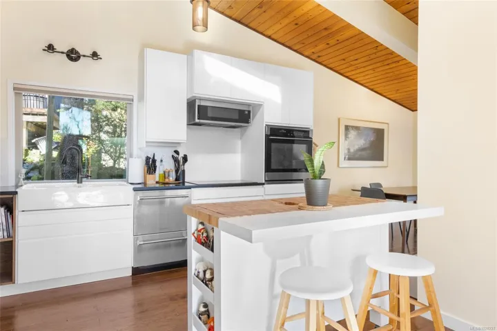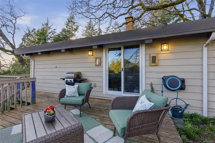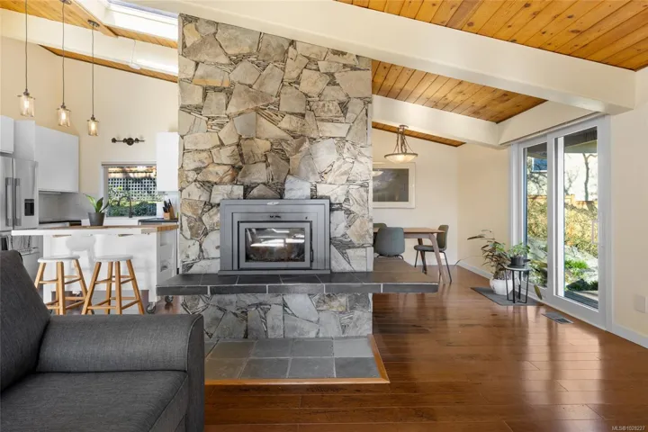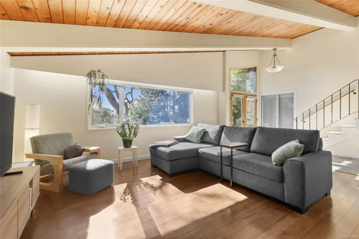 This home exemplifies mid-century modern style, creating harmony between the built environment & the wild beauty of the outdoors. In desirable Maplewood, sitting on a quiet hidden lane, offering central convenience & exceptional privacy. Natural materials, vaulted ceilings, clean lines & open plan living. Expansive windows&skylights bathe the interior in sunlight&provide lovely views day&night. Modern kitchen w/luxury appliances flows to formal dining&out to sun-soaked deck & easy-care yard, ideal for family&entertaining. Upstairs are 3 bedrooms&2 baths. Spacious primary has private ensuite. A self-contained 1 BR suite w/its own entrance&laundry offers flexibility for family, guests, or mortgage help. Original slate FP, T&G ceiling, wrought iron railings all blend beautifully w/the upgrades of new windows, top quality blinds, fresh paint, metal roof&2 heat pumps. Great parking for cars&toys. Close to transit, schools, groceries, rec centre, golf&shops.