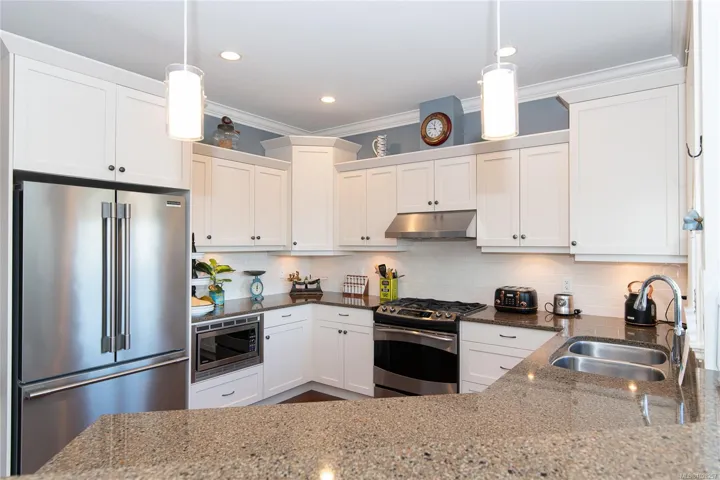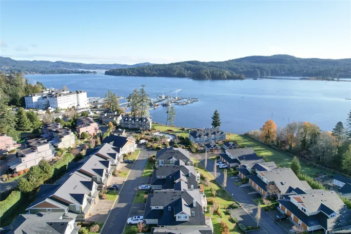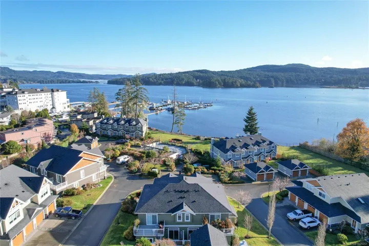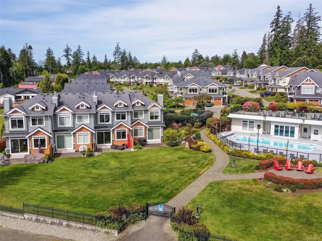Rare Heron View town home offering some of the most magnificent, uplifting Ocean Views within this impressive oceanfront development. The upper main’s elevated position overlooks the amenity centre & provides exhilarating views over the harbour, generous kitchen layout with quartz counters, SS appliances & gas cooking, white shaker cabinetry, mocha stained hardwood floors through the open concept main adjacent dining and spacious living room with gas fireplace and huge picture window to soak in those views! You’ll love the master suite with NEW custom walk-in, ensuite & private patio with slider access. A 2nd large living room down with 2 bedrooms & 4 piece bath, rear patio round out the lower level. The townhome boasts a prized double garage with larger than average driveway. An amenity pkg beyond compare: Tennis, Swimming Pool, Gym, Sauna, Social Room, Social Gas Fire Pit. Nearby dining options, adjacent to marinas, launch your kayak from the private beach.