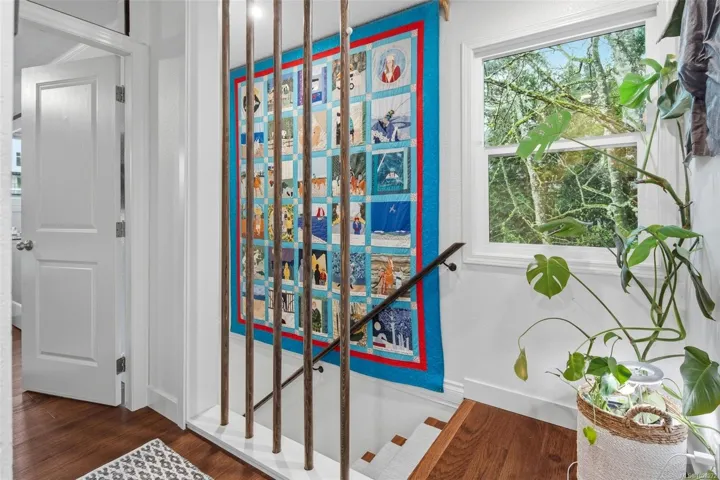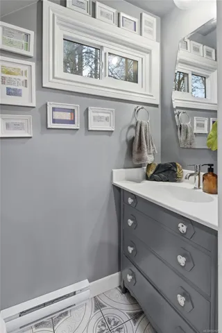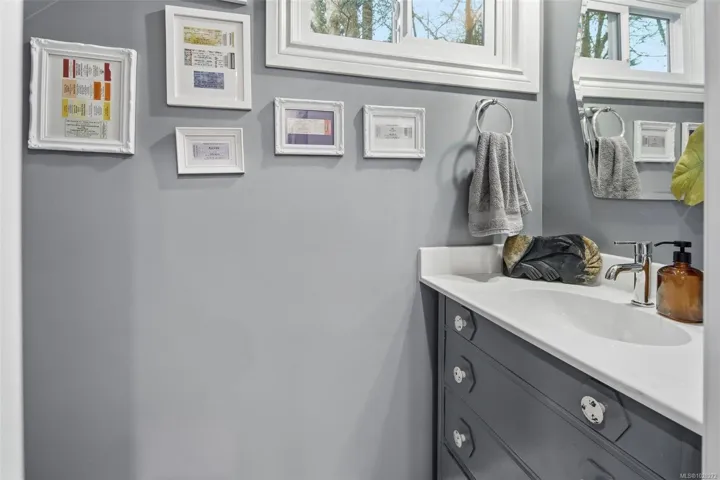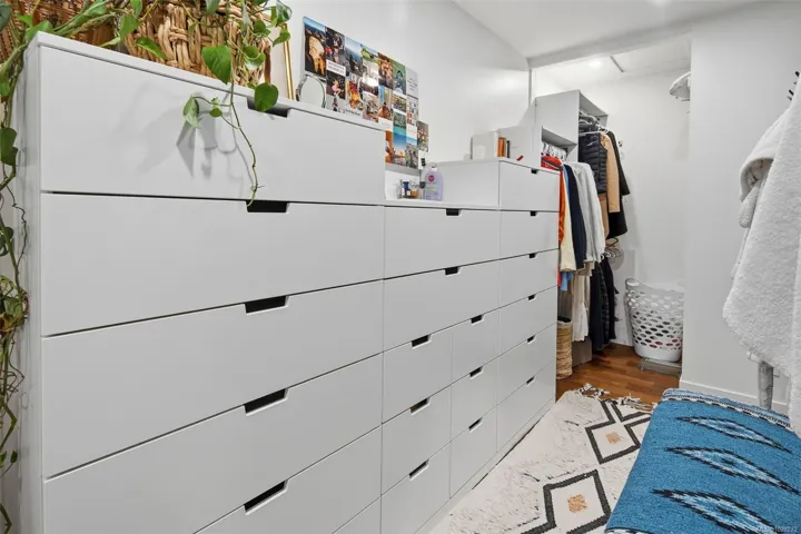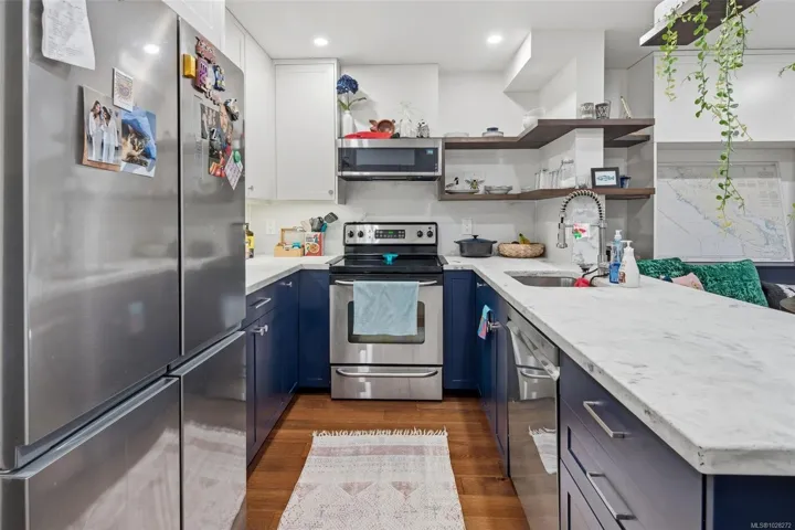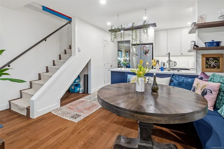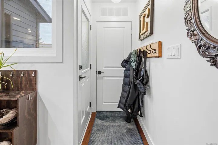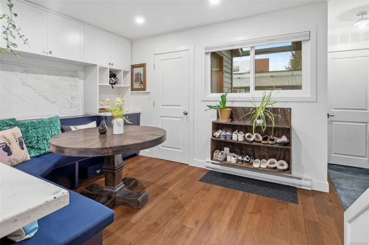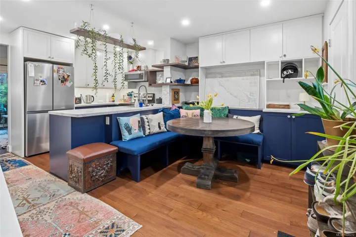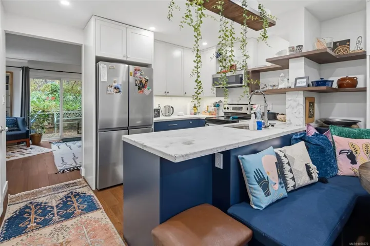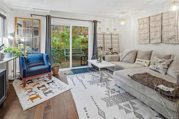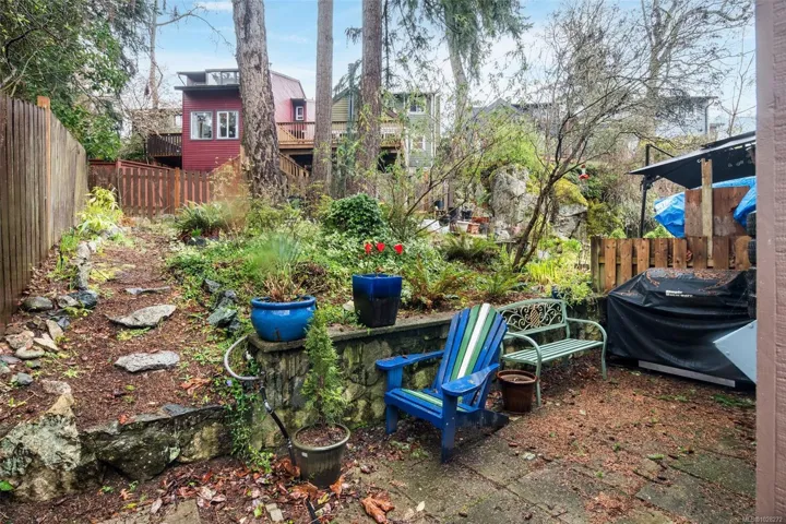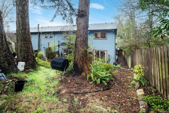 This fully reno’d corner unit is the most private of the 14-unit complex. Adjacent to the forested Portage Park and accessed by a secret gate from the garden leading to trails, playgrounds, a beach and the E&N bike route- ride traffic-free to downtown Victoria! A large pet-friendly yard and patio that suits a BBQ completes the outdoor package. Inside, extensive reno’s have touched nearly every surface: most recently a full kitchen overhaul with custom cabinets, concrete counters, new appliances & unique open shelving which seamlessly blends the kitchen & dining. The unit boasts a distinctive bedroom layout having combined two smaller bedrooms to make a generous primary suite with a walk-thru closet and large window overlooking the back garden. The secondary bedroom has a walk-in closet and east facing window flooding with morning sun. On-site parking and a large accessible attic for storage add practicality. Ideal for nature lovers seeking privacy & convenience at an approachable price