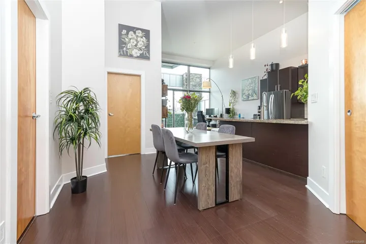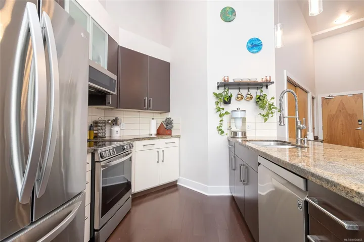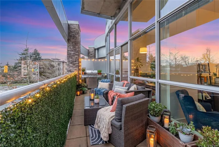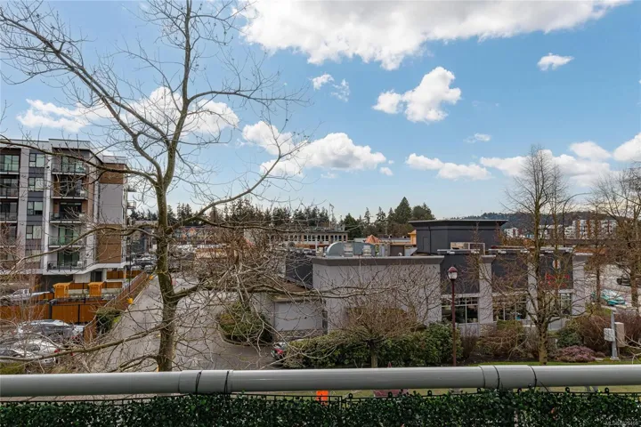 *Open House Sunday 22nd 1-3pm* You’ll love this modern and spacious condo that offers stylish living in the heart of Langford. From the moment you walk through the door, you’ll be awed by the soaring 13’5″ ceilings and floor-to-ceiling windows that fill the home with natural light. The bright, open-concept layout features gleaming hardwood floors and a contemporary design. The kitchen is finished with granite countertops, tiled backsplash, stainless steel appliances, and sleek cabinetry, flowing seamlessly into the living area. Enjoy the large south-facing deck, perfect for entertaining, container gardening, or relaxing while taking in the sunset. The primary bedroom offers high ceilings, a walk-through closet, & ensuite. The second bedroom/den is ideal for a home office or guest room. Reflections is known for its striking curved architecture and amenities including a rooftop running track & outdoor pool. Just steps to Goldstream Village shops, cafes & restaurants. Come see it today!