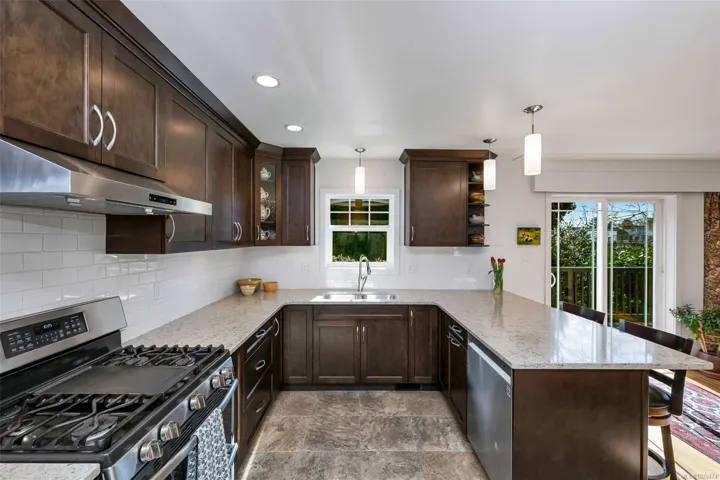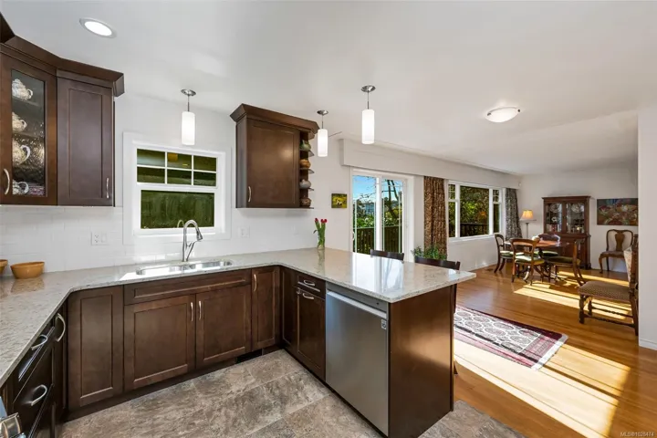 Welcome to 449 Victoria Avenue in south Oak Bay. This 2600 ft updated 5 bedroom, 3 bath family home is set back from the road, and boasts an expansive ‘secret’ south-facing private flower and vegetable garden, just steps from McNeill Bay. Designed for entertaining, the light-filled main level features oak floors throughout, a spacious living room with gas f/p, chef’s kitchen with ss appliances & gas range, opening onto a large deck. The generous primary bedroom features a 2-piece ensuite & the adjacent bedroom could be an ideal lounge or nursery. A sunny 3rd bedroom and updated 3 piece BA complete the main level. The garden level features two generous bedrooms, a 4-piece bathroom, laundry room, artist’s studio, and a cozy family/media room with a wood-burning insert. The property was renovated in 2013 -new kitchen, updated wiring, windows, attic insulation, refreshed lower BA, & two car garage with upper storage. Every detail has been considered in this warm and functional family home