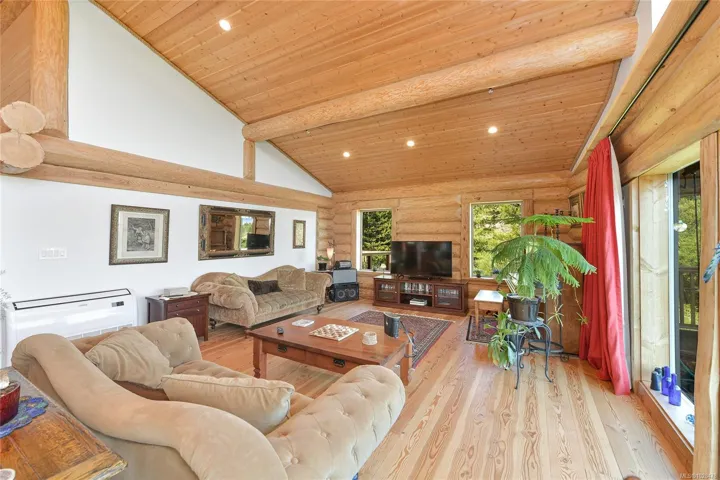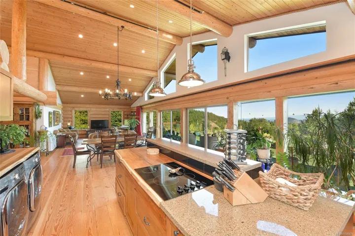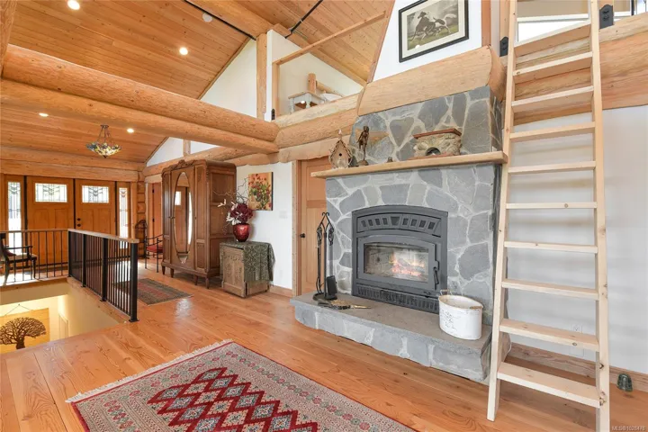 A luxurious log home of exceptional craftsmanship and presence, this dramatic 6.5+ Acre estate is revealed at the end of a long, tree-lined driveway, where grand timber architecture, soaring 17’1″ vaulted ceilings, and sweeping floor-to-ceiling windows showcase the beauty of the West Coast landscape in unforgettable fashion. Sun-drenched open-concept living is elevated by refined finishes, a chef’s kitchen, heated floors, and an impressive wood-burning fireplace, while the private main-level primary suite—with its spa-inspired ensuite and deck access—captures golden west-facing light. The lower level extends the luxury with a suite with separate entrance, den/music room and a generous hobby/rec room, all anchored by an expansive 4-car garage and abundant parking. Detached outbuildings and a greenhouse complete this rare, resort-like sanctuary where privacy, elegance, and natural grandeur come together in a truly remarkable offering.