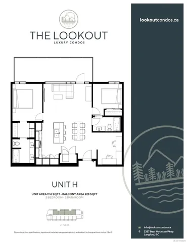 MOVE IN READY! SHOW SUITE now open 12-2pm (Thursday, Friday & Saturday) THE LOOKOUT by Aquila Pacific — luxury mountain living at its finest. Nestled among the trees, this community offers sweeping views of Florence Lake, Olympic Mountain Range & Mount Baker. Thoughtfully designed 1, 2 & 3 bedroom homes feature a premium integrated appliances & high-quality fixtures & finishes – no detail overlooked. Whether you’re after stunning views, convenient location, an amenity-filled building or larger units with patios, there’s a floor plan to suit every lifestyle – including select homes with massive patios & exterior access ideal for entertaining! Residents enjoy amenities not found in many buildings: lounge with test kitchen, outdoor patio & party room, observation deck, fitness studio + yoga room, bike-tuning area & pet-washing station. With quick access to the highway & Bear Mountain recreation,THE LOOKOUT blends the convenience of urban living with the tranquility of a mountain retreat.