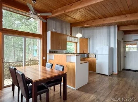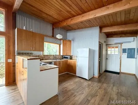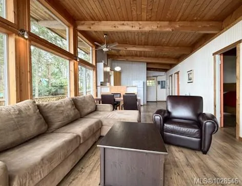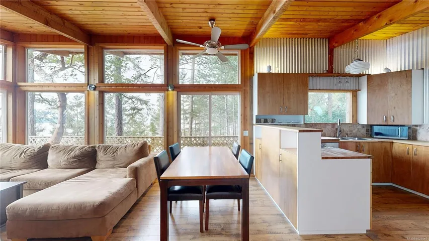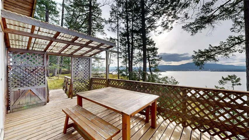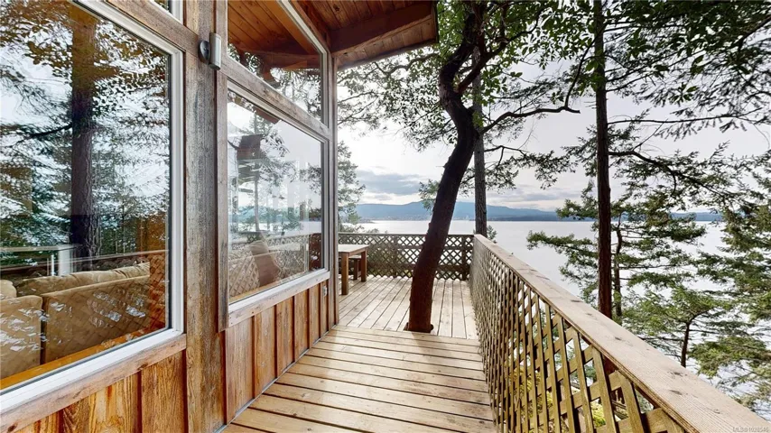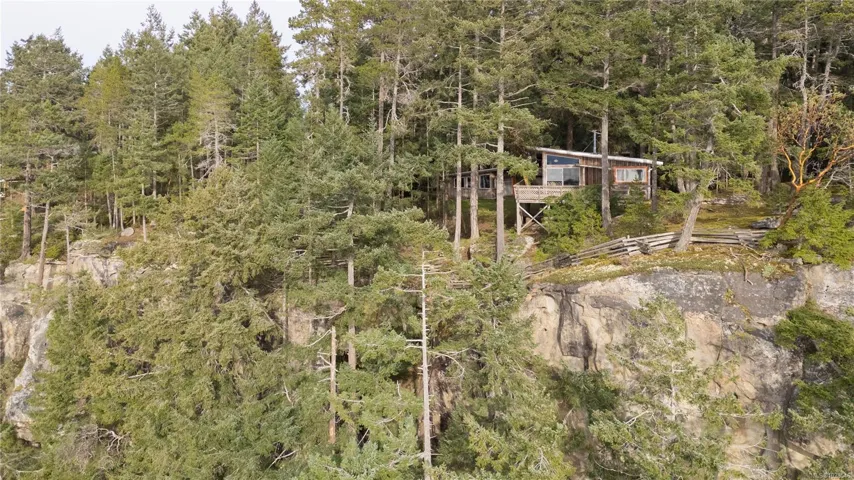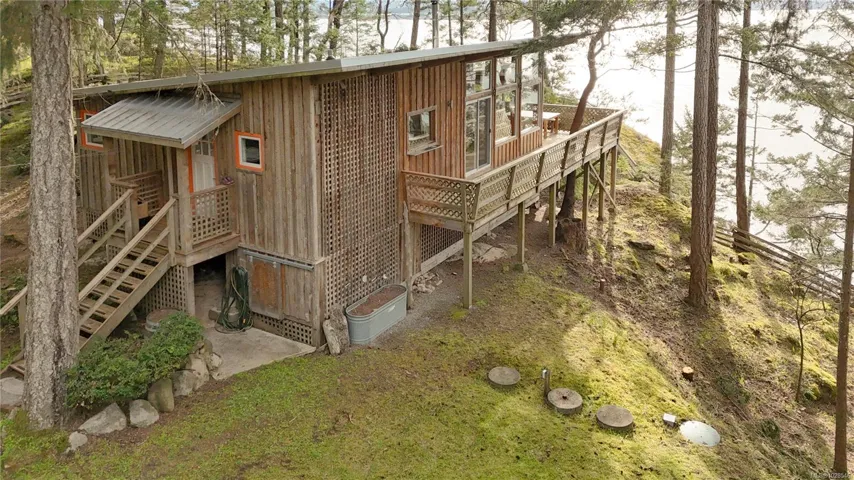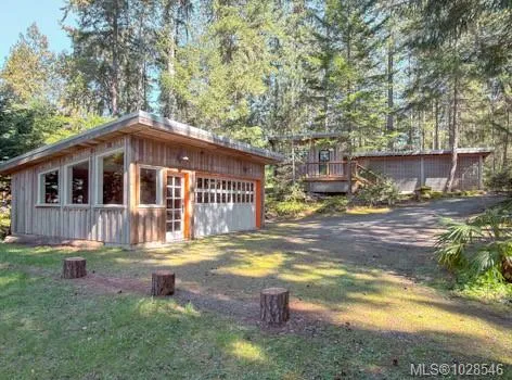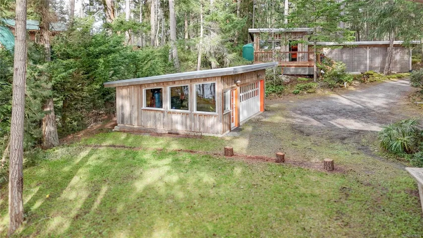 Perched along the shoreline, this West Coast home captures panoramic views of the ocean, islands, and city lights. Set on 0.92 acres, this private property offers a quintessential island setting, with arbutus, fir, and pine framing mossy rock outcroppings along the high bank waterfront. The 2-bedroom, 1-bathroom home features vaulted wood ceilings, expansive windows, and a warm, modern feel. The contemporary kitchen opens to the main living space, where a heat pump and woodstove provide year-round comfort. Patio doors lead to a generous deck, perfect for enjoying passing ferries, marine life, and sunsets. An office and spacious laundry room add flexibility. The property also includes a 24×20 double garage with heated concrete floors, as well as a detached 19×12 studio with its own deck and attached carport. The septic system was installed in approximately 2005. All information should be verified by a buyer if deemed important. Full information package is available.