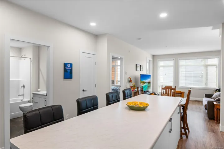 Welcome to this one bedroom east facing condo in one of North Nanaimo’s newest buildings ‘The Met’. This unit is situated within walking distance of all amenities, Woodgrove Mall, and many great restaurants. The kitchen features stylish two-tone cabinetry, large island with eating bar, and four stainless appliances. The open concept living and dining area offers large windows, plenty of natural light, and access to the covered balcony. Completing the unit is a bedroom, four piece bathroom, and laundry room with a stacking washer and dryer. The building allows for two pets with no size restrictions. The unit has an underground parking stall and a separate storage locker. For more information see the floor plan, 3D tour and video. All data and measurements are approximate and must be verified if fundamental.