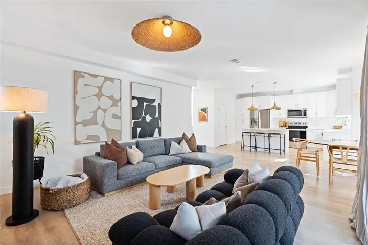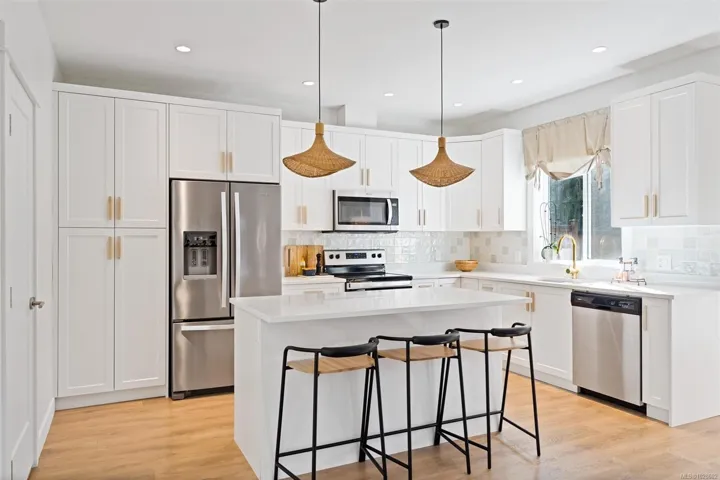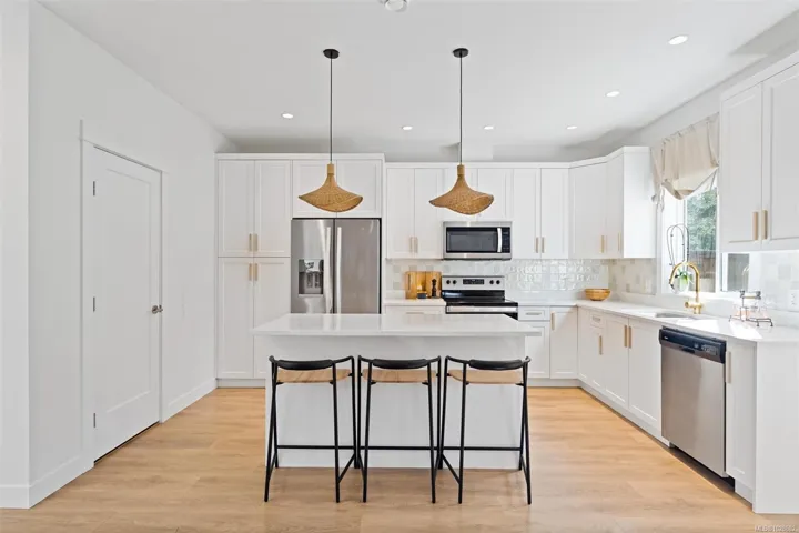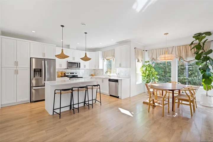 Tucked away on a quiet no-through cul-de-sac and backing onto serene forest, this stunning like-new home offers privacy and modern luxury. Thoughtfully updated, it features a ducted heat pump, professional full-home interior paint, seven designer lighting upgrades, and new matching laminate flooring upstairs. The chef-inspired kitchen boasts stainless steel appliances, quartz counters, a large island, walk-in pantry, soft-close cabinetry, and a solid brass faucet. The main home includes 4 bedrooms. Enjoy forest views from the dining area and relax in the living room with a gas fireplace and in-wall TV hookups. Step outside to a private yard with covered patio, gas BBQ hookup, and green space. Bonus legal 1-bedroom suite above the garage, with separate entrance and laundry. Hot water on demand, double garage, balance of 2-5-10 warranty, & NO GST. Just minutes to the golf course, beaches, walking trails & all Westshore amenities.