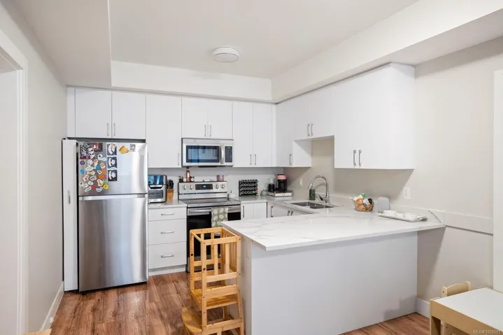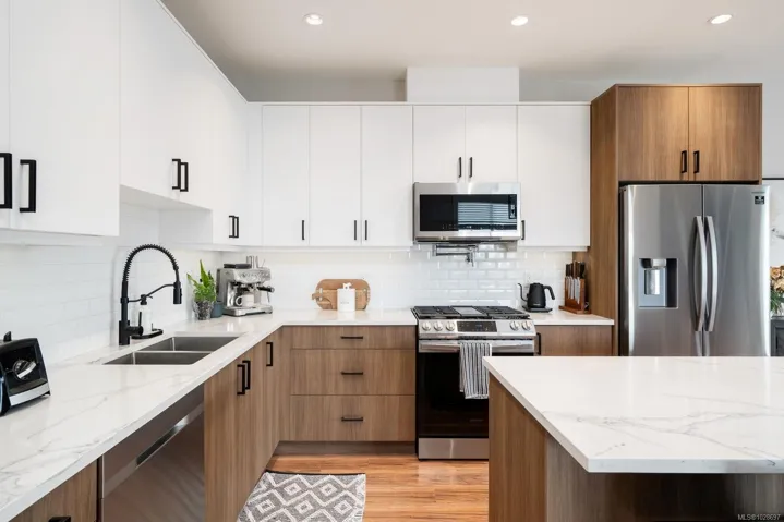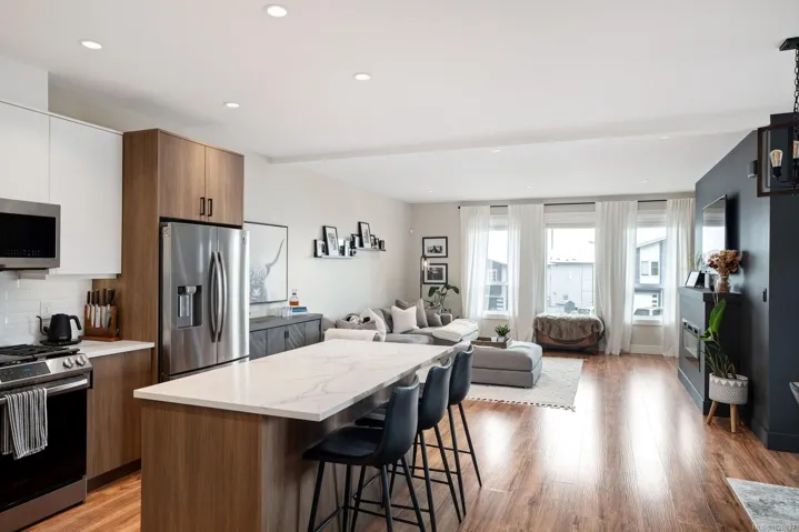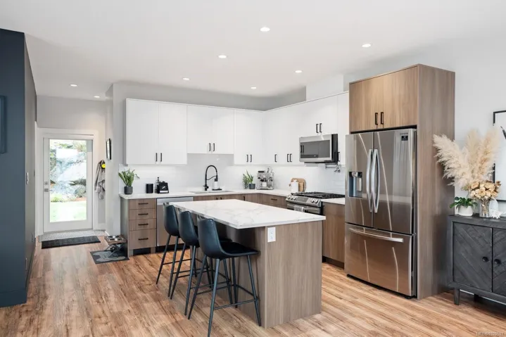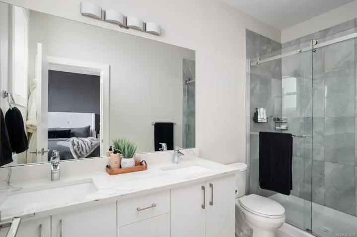 Pleased to present this luxurious, modern West Coast home situated in Sooke’s seaside community. Set high on the hill, this half-duplex boasts spectacular Ocean VIEWS over the Strait of Juan De Fuca. Feel at ease the moment you step inside the 6Bed, 4Bath, 2635 sq/ft home. Attention to detail throughout will impress even the most discerning buyer. Abundant natural light fills the open-concept living and dining space, with easy access to the private, fenced rear yard—perfect for pets and kids. The stunning chef’s kitchen features Quartz counters, SS apps, Gas range & a large island. Upstairs find the primary suite w/a large walk-in, spa-inspired ensuite, 2Beds & 1Bath. The lower 2Bed 1Bath SUITE w/its own W/D, separate entry & private yard is ideal as a mortgage helper or for multigenerational living. Bonuses include high efficiency dual heat pumps & ample parking. Located at the end of a quiet cul-de-sac in a family-friendly neighbourhood, close to trails, schools & beaches.