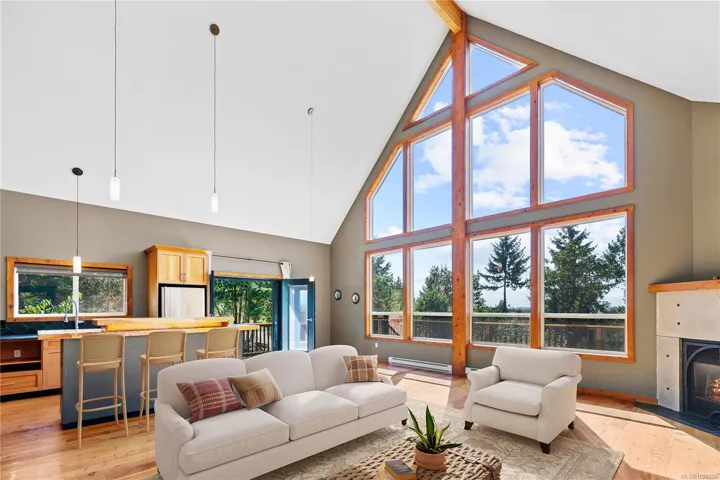 You have found peaceful country retreat just 20 minutes from town. Not in Spec Tax zone! Set on nearly 5 acres with forested land bordering protected marsh, this custom Westcoast home sits high with stunning views of trees, valley, mountains, and southern skies. Featuring 2 beds, 2 baths, and an open-concept living area with a country-style kitchen, gas fireplace, and floor-to-ceiling 23’ windows. Beautiful wood floors crafted from bridge timbers add timeless charm. Enjoy panoramic views from the master soaker tub or host BBQs on the wraparound deck. The lower level with a separate entrance awaits your ideas. Outside, find a seasonal pond, hot tub, fenced garden with raised beds and fruit trees, plus a private road with no through traffic. Explore further down the stairs to your nature sanctuary. Zoning may allow for a garage or second home (buyer to verify). Experience the beauty, privacy, and potential of this exceptional property.