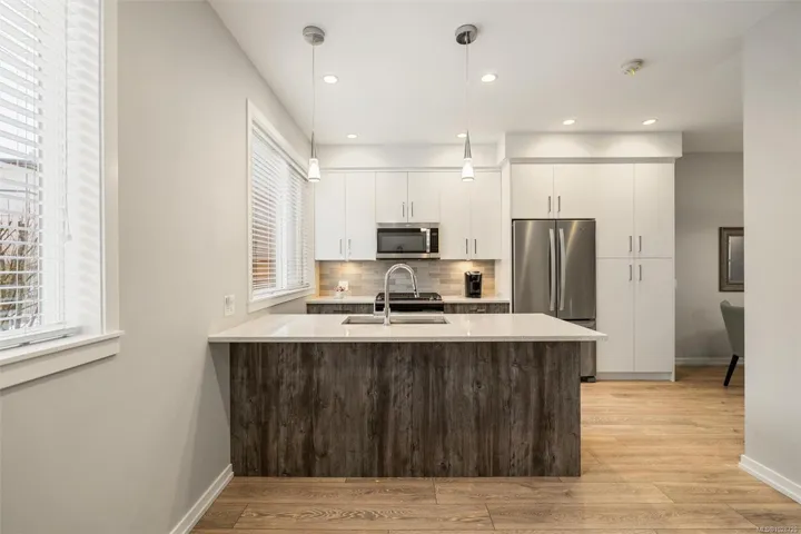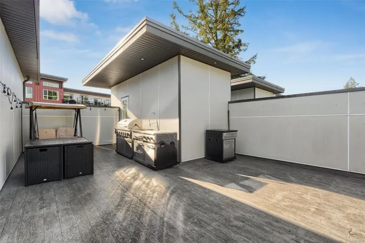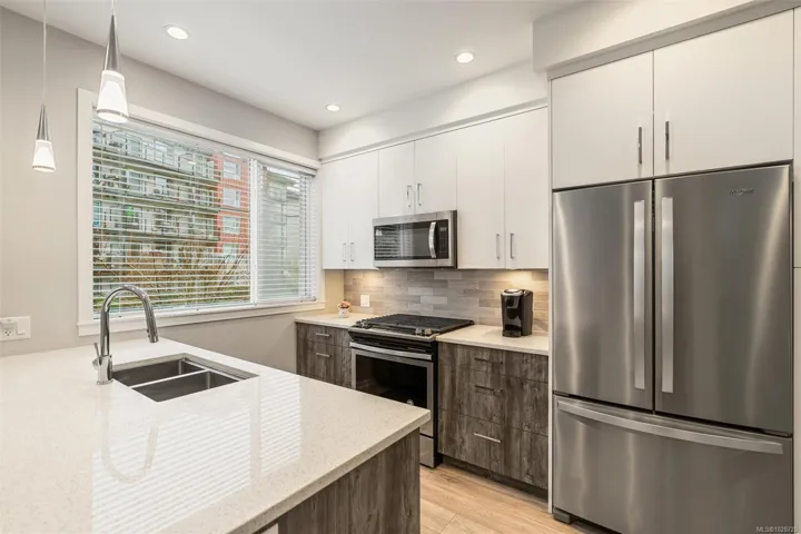 Welcome to Fusion Ten, a boutique collection of contemporary townhomes offering stylish living over three thoughtfully designed levels, CROWNED BY AN EXCEPTIONAL ROOFTOP PATIO. This spacious 2 bed + office home features two generous primary bedrooms, each with its own private ensuite for comfort and privacy. The main level offers an open-concept layout with high ceilings, expansive windows, and seamless flow between living, dining, and kitchen areas—perfect for everyday living and entertaining. The modern kitchen showcases sleek cabinetry, quartz countertops, quality appliances, and a functional island. A versatile office provides the ideal work-from-home space. Enjoy outdoor living on the stunning rooftop patio—perfect for relaxing or hosting under open skies. Complete with a double garage and ideally located close to shopping, parks, schools, and all Westshore amenities. Westshore amenities.