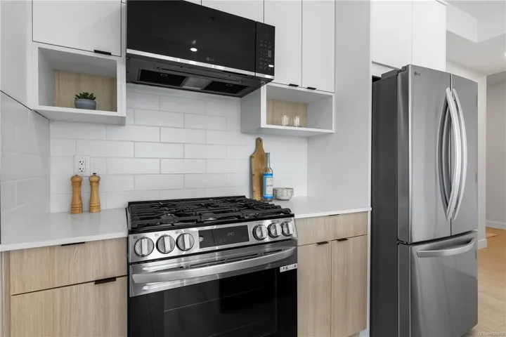 SHORT TERM BUYER INCENTIVE OF $10,000 ON 1 BED AND $15,000 ON 2 BED UNITS – Welcome to Millstream Residences. This functional and thoughtfully designed TOP FLOOR CORNER 1 bedroom unit home offers 657 sqft of living space with balcony, perfect to enjoy during the warm summer months. The open living space features oversized windows that flood the space with tons of natural light, durable neutral flooring and matte black hardware and details throughout that anchor the home. The kitchen features SS LG appliances, quartz countertops and island and two-tone cabinetry with ample room for storage. The building features a large outdoor space where you can connect with your neighbours and enjoy the green spaces, seating, fire tables, BBQ’s and playground. Centrally located in the heart of Langford, you are just minutes from amazing amenities and recreation, schools, hiking trails, parks and lakes. PRICE + GST – 2 PARKING STALLS INCLUDED