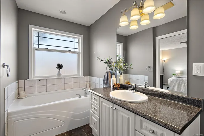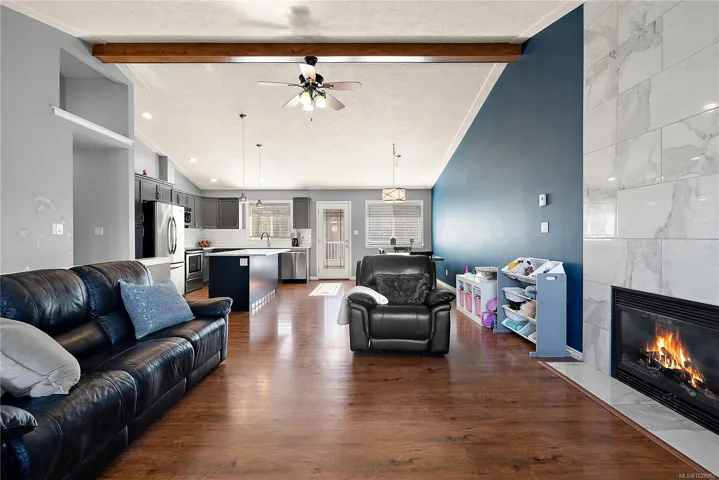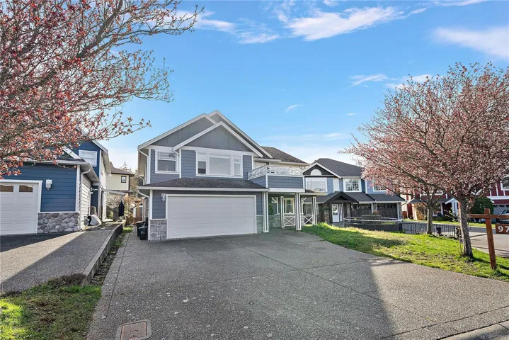 971 Wild Blossom Crt, Valley View Estates. Built in 2007, tucked away on a family-friendly cul-de-sac on a lot. With 3 bedrooms upstairs a den downstairs (separate from the suite) – offering flexible living space for home office, gym or guest area. Includes a 2 bed suite on the main level with plenty of room for a large family or ideal mortgage helper. Bright open-concept layout w/ large kitchen island, natural gas fireplace & vaulted ceilings. The spacious primary bedroom includes a luxurious ensuite. Updates: newer countertops, refreshed fireplace, new carpets in bedrooms. Suite has separate entry & private laundry, excellent flexibility for extended family or rental income. Enjoy SW-facing rear deck and a generous yard, plus a hot tub hookup conveniently located at the bottom of the deck stairs. Double garage + ample parking. Added privacy w/ undevelopable land behind. Close to Galloping Goose Trail & transit—peaceful, convenient family home at great value!