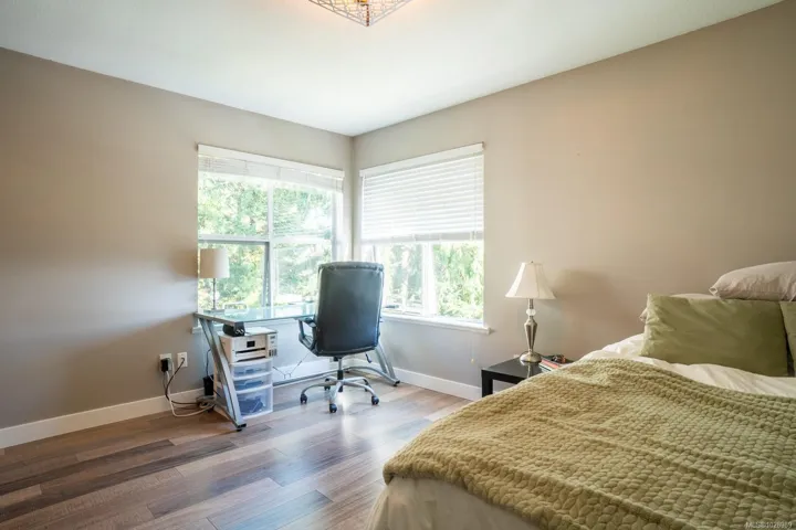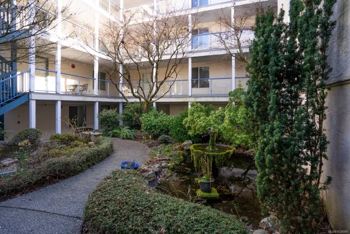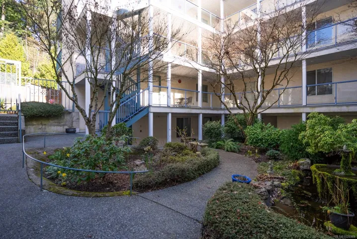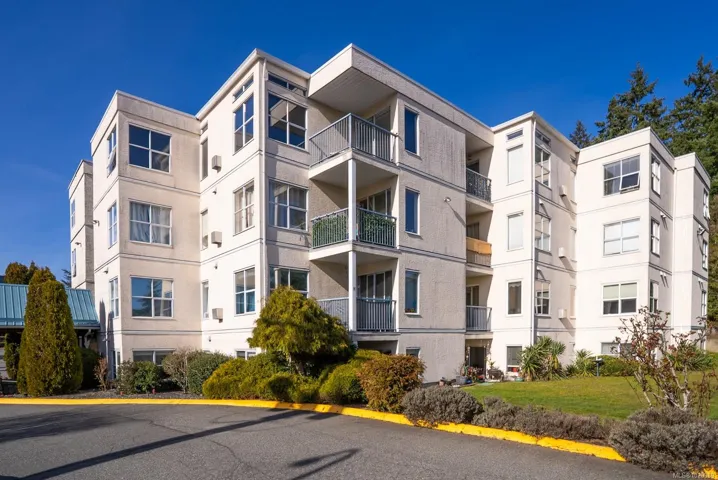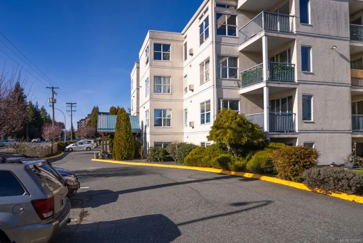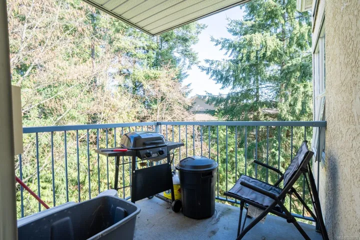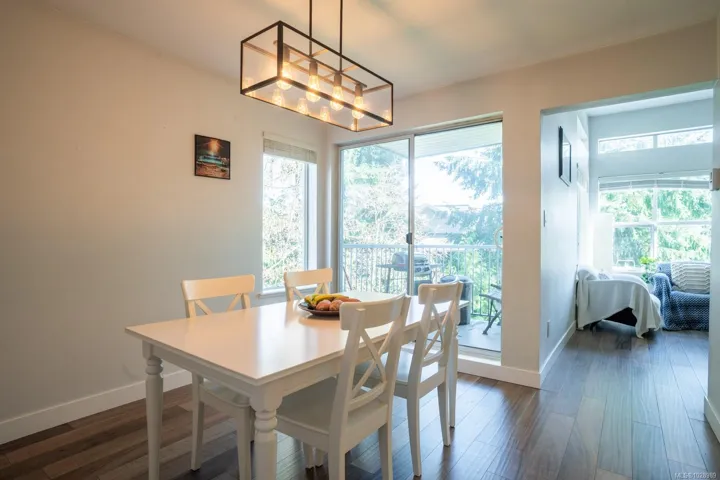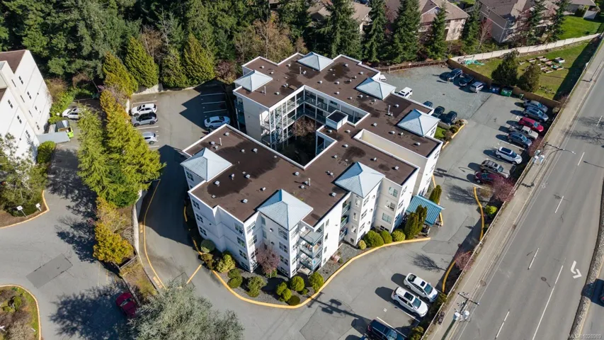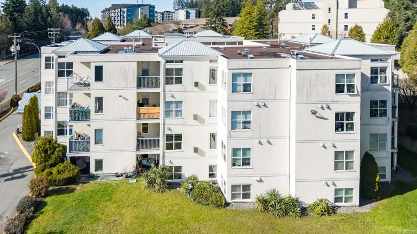 Stylish 2 bed, 2 bath condo in desirable North Nanaimo. This 964 sq ft home is close to restaurants, shopping, schools, parks, and nature trails. The open-concept layout connects kitchen, dining, and living areas for comfortable living and entertaining. The renovated kitchen features custom cabinetry and modern finishes. The bright living room offers forest views and a cozy natural gas fireplace with marble mantle. Updated flooring and light fixtures add a modern touch. The main 4-piece bathroom has quartz countertops, a custom vanity, and updated tile. The primary bedroom includes a walk-in closet and private 3-piece ensuite. Enjoy the balcony overlooking trees. In-unit laundry, a parking stall, and visitor parking included. Pet-friendly, rentals allowed, no age restrictions. Data approximate, verify if important.