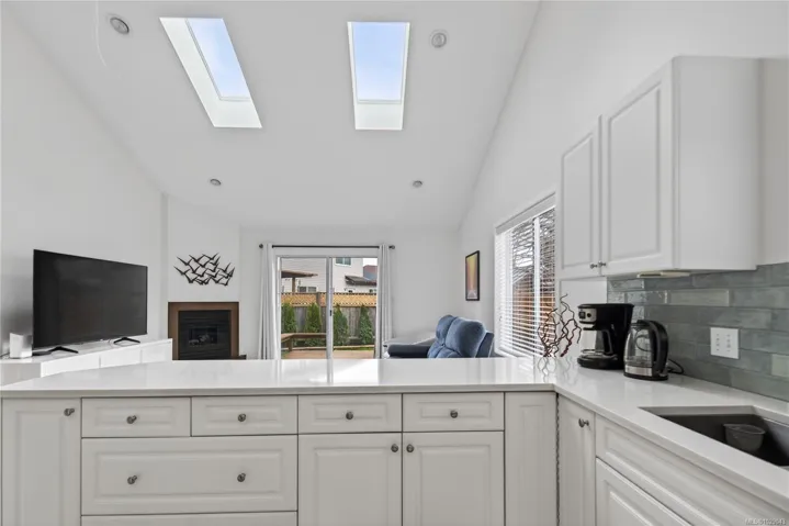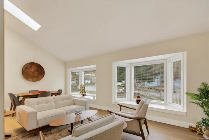 The front features an open-concept living and dining area with vaulted ceilings, bay windows, and a skylight that fills the space with natural light. At the rear, the open kitchen and family room include skylights, a cozy fireplace, and access to the deck and fully fenced backyard.