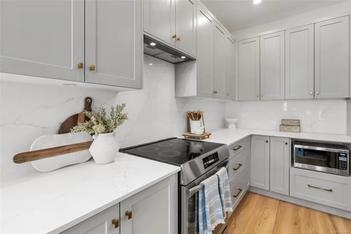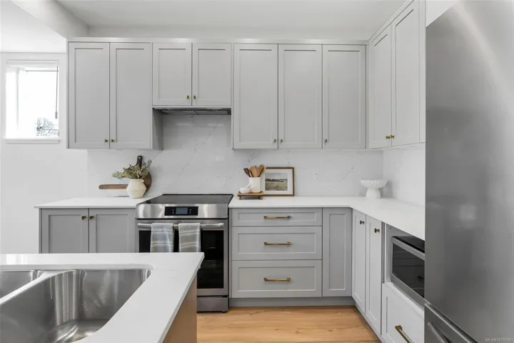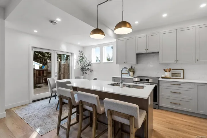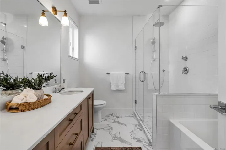 3 Homes Left | Welcome to “The Grove” – a collection of 4 beautifully finished homes located in the heart of Saanich West. Thoughtfully designed, built & staged by Olive & Oak Homes – offering over 1,700sq.ft of functional living space. The main level features an inviting entry with separate office/den, chef’s kitchen with stainless appliances, island for entertaining, plenty of storage & quartz countertops & backsplash. Open living & dining areas with fireplace and access to the private, fully fenced patio & yard space – another great alternative to coming & going with your pet or visitors. Upstairs, 3 generously sized bedrooms including the huge primary suite w/ a walk-in closet plus ensuite with soaker tub, walk-in shower & heated floors. The laundry room is also conveniently upstairs & features countertop & cabinet storage! Other features include an efficient heat pump for heating & cooling and oversized attached single garage. 2/5/10 New Home Warranty