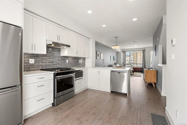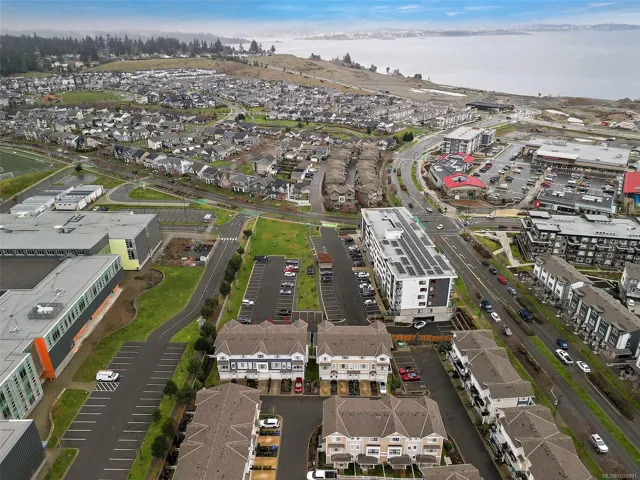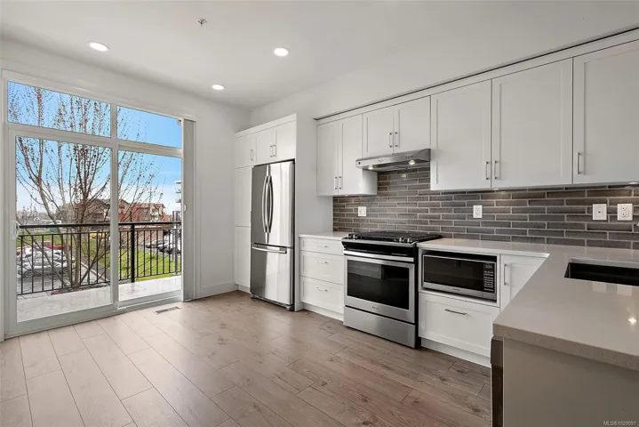 Welcome to life in Royal Bay, one of Colwood’s vibrant and family-focused coastal communities. This bright executive townhome offers 3 bedrooms and 2.5 bathrooms in a thoughtfully designed layout that blends modern style with everyday comfort. The beautifully appointed kitchen features quartz countertops, a natural gas range, dishwasher, range hood, microwave and fridge, creating a stylish and functional hub for daily living. The open living and dining spaces are filled with natural light and highlighted by impressive 9-foot ceilings, giving the home an airy, welcoming feel. A private fenced patio offers a quiet outdoor space to relax and enjoy fresh ocean air, while the attached garage provides convenient parking and storage. Just steps from parks, playgrounds and scenic walking trails, and minutes to Royal Bay Beach, excellent schools and growing village amenities, this home offers the perfect balance of coastal living and connected community.